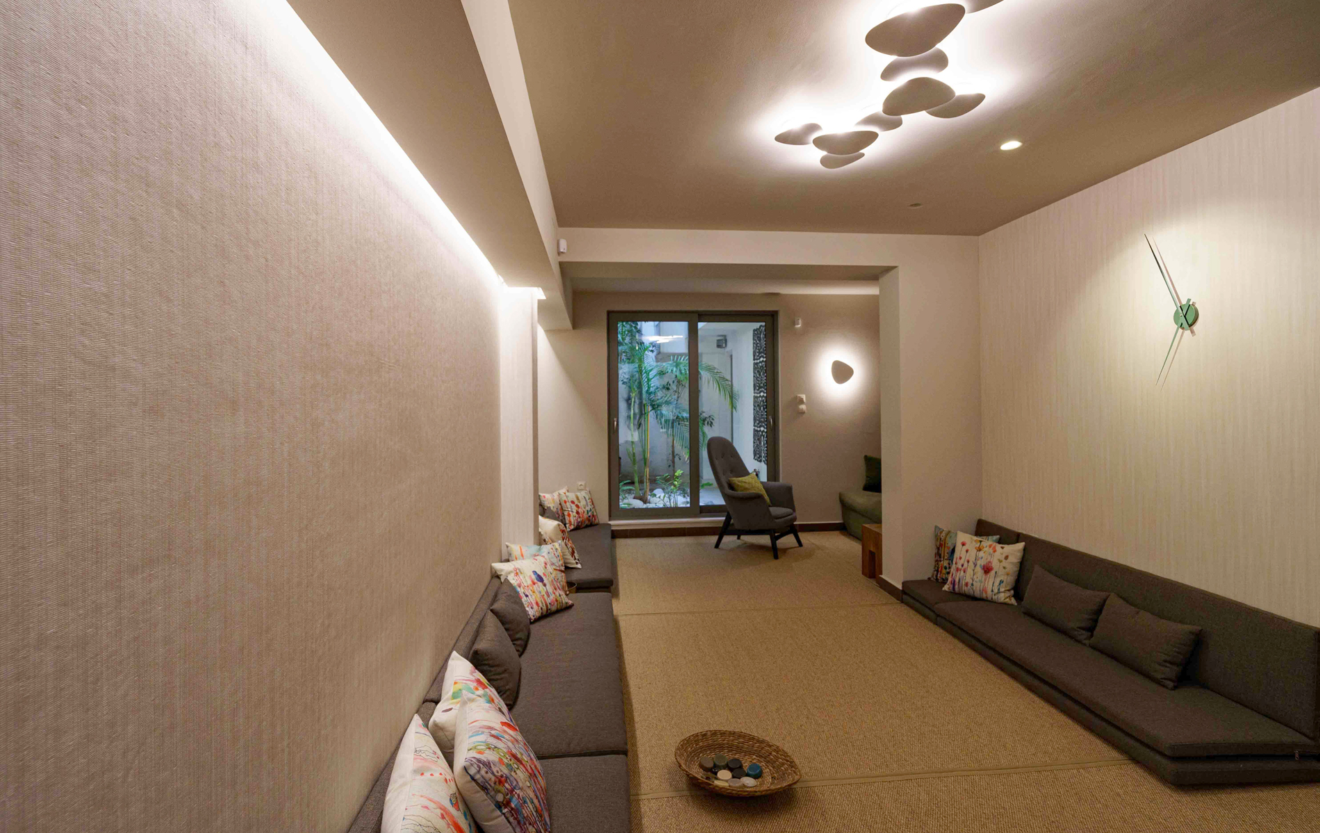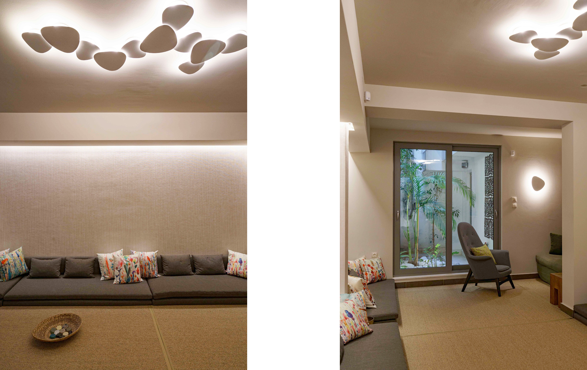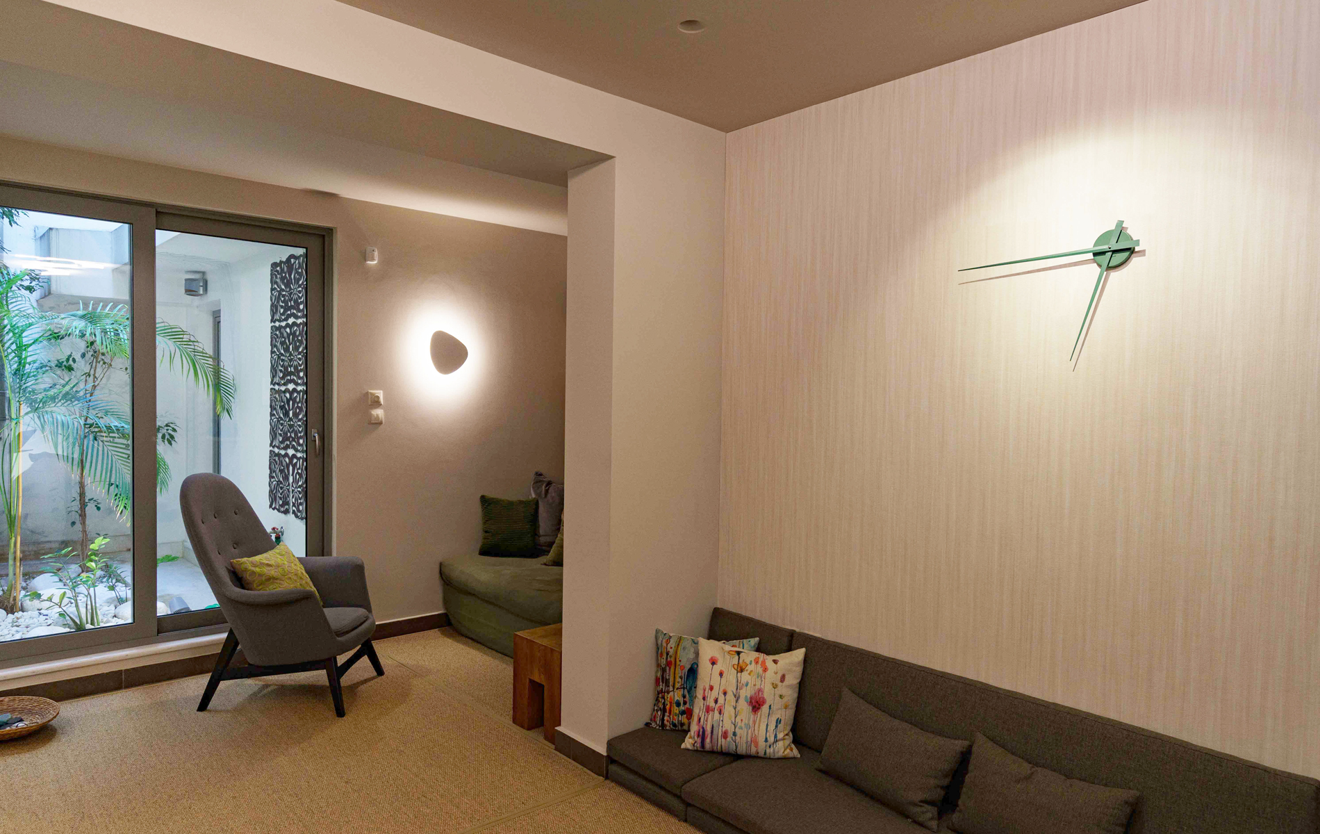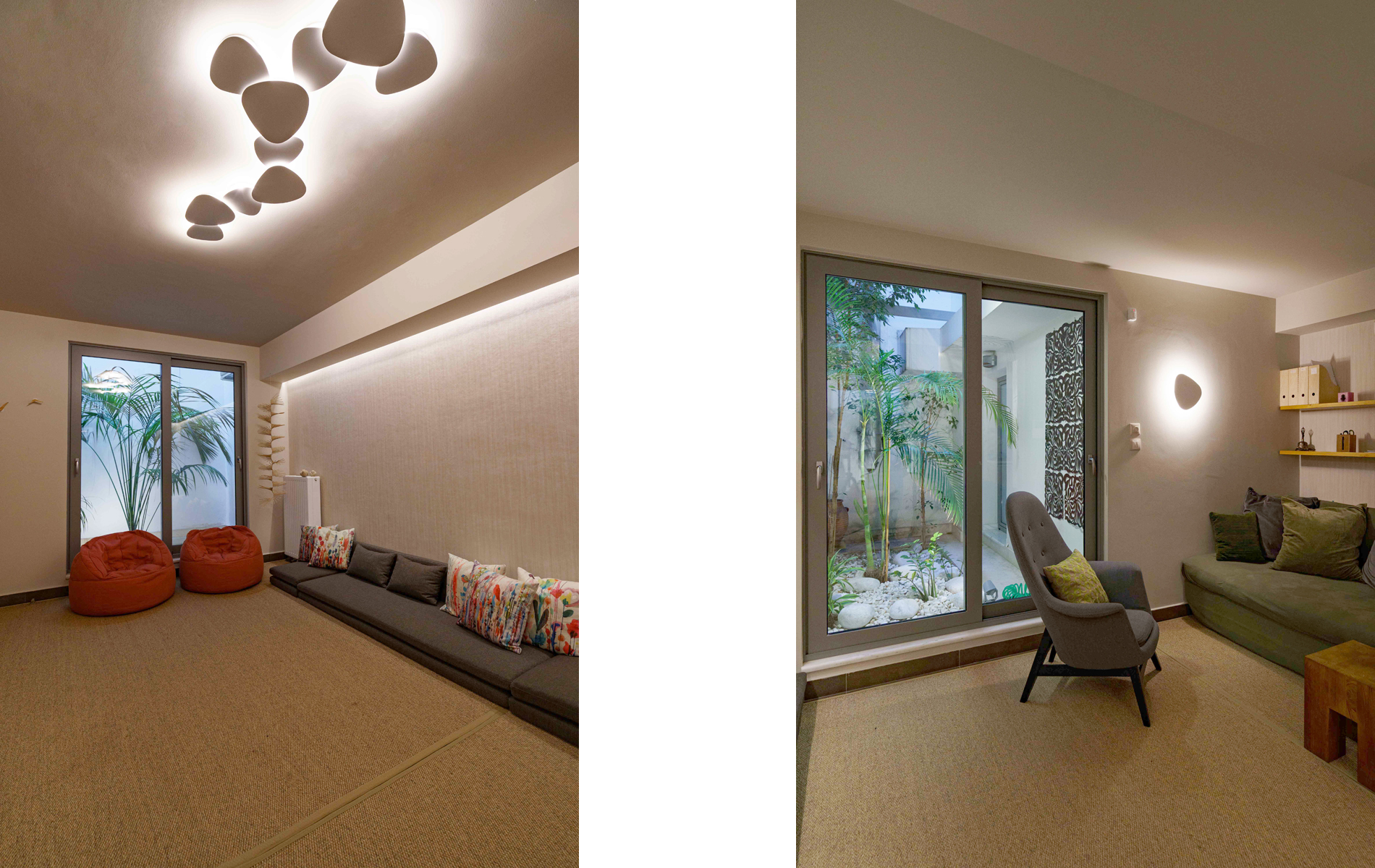 Two separate rooms were connected into one to create a space aimed for group and individual psychotherapy sessions.  The derived space is long and narrow with two atrium-gardens on both ends, which offer natural light but also a feeling of openness. Main request was to create a space that offers healing, tranquility, and comfort to clients. To achieve desired result, a natural color scheme as well as natural materials and textures were selected. In addition, artificial lighting is indirect and discreet without causing discomfort to the eye. Finally, a low in height seating area was designed as a means to create an impression of a more spacious, larger area.