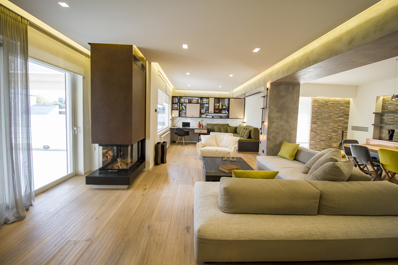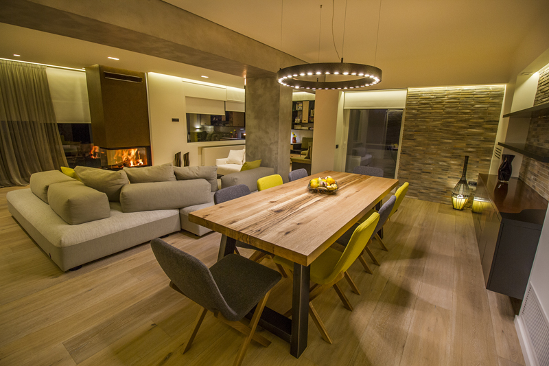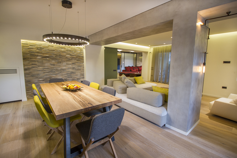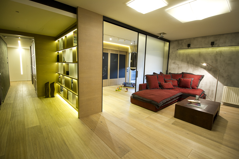 The positions of the bedrooms, bathrooms and the kitchen were kept as they were. However, by changing the internal structural partitions of the residence, the spaces of everyday use of the whole family i.e. the kitchen, the sitting room, the “daily” room, the dining room, and the playroom, were unified both visually and functionally.