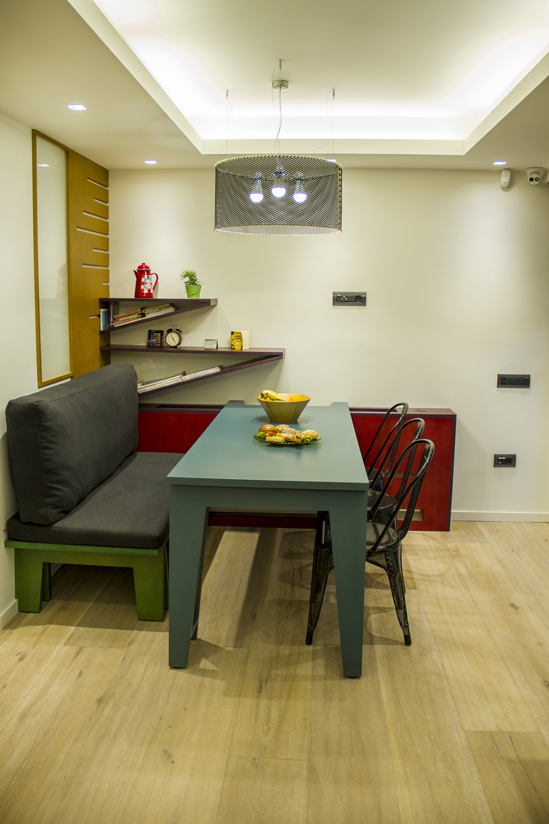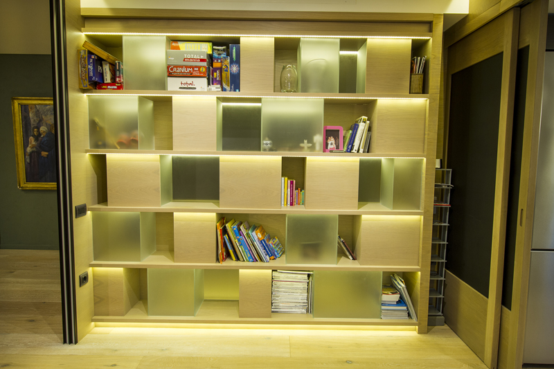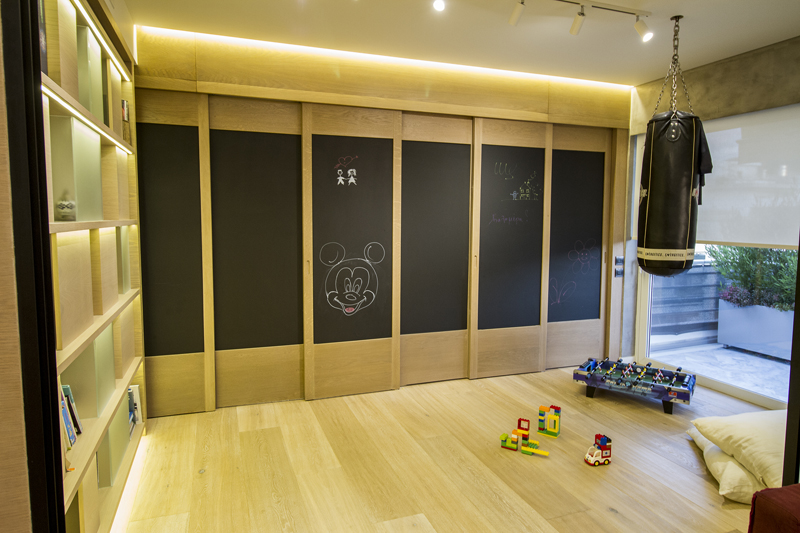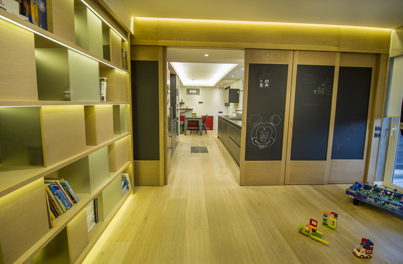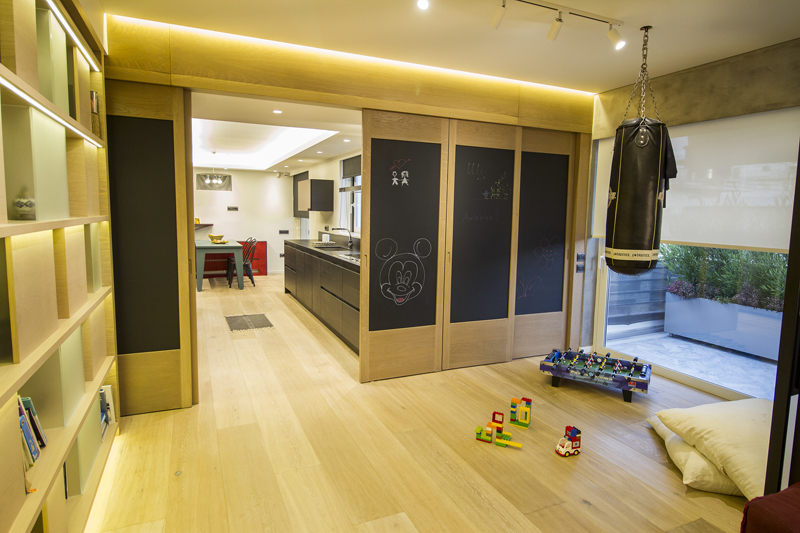 Sliding doors allow for the isolation of the kitchen space and the playroom when required. The sliding doors between the kitchen and playroom are made of wooden frames that carry a blackboard internally on both their faces for children’s painting and notes.