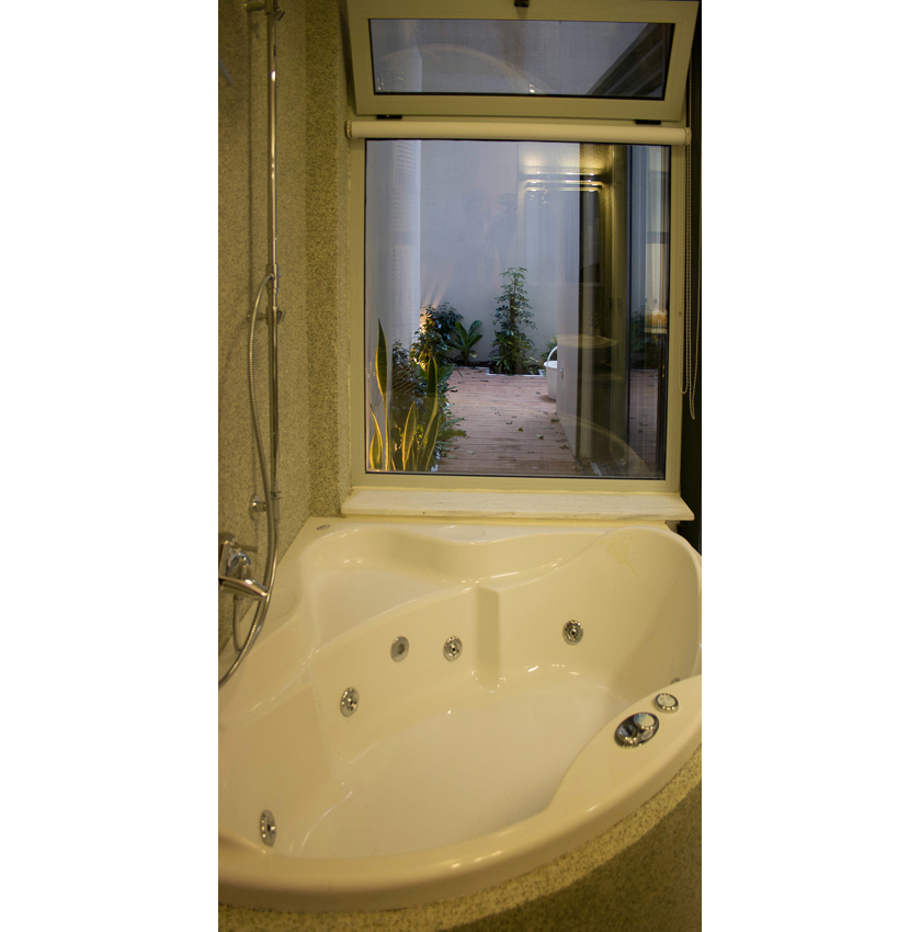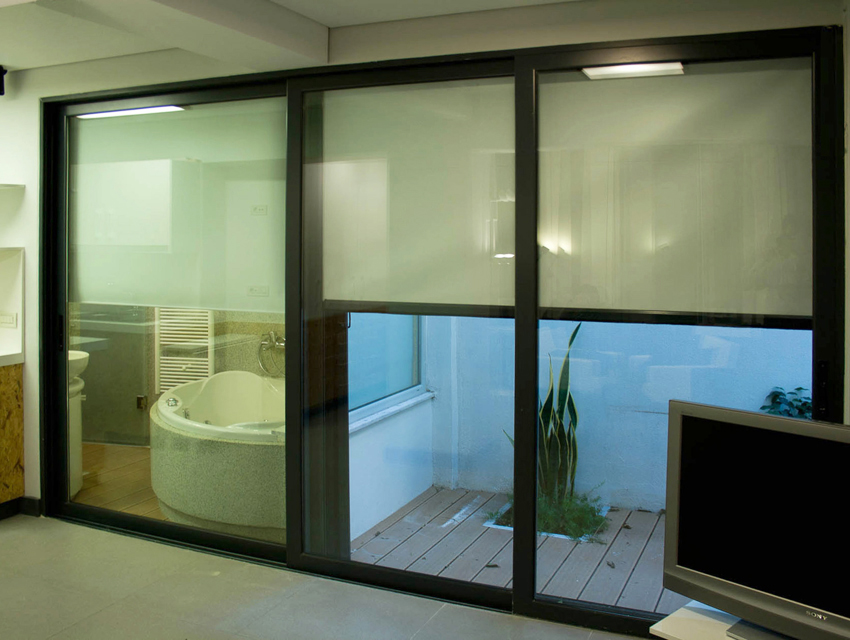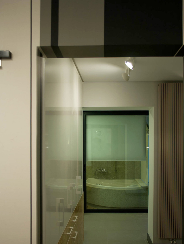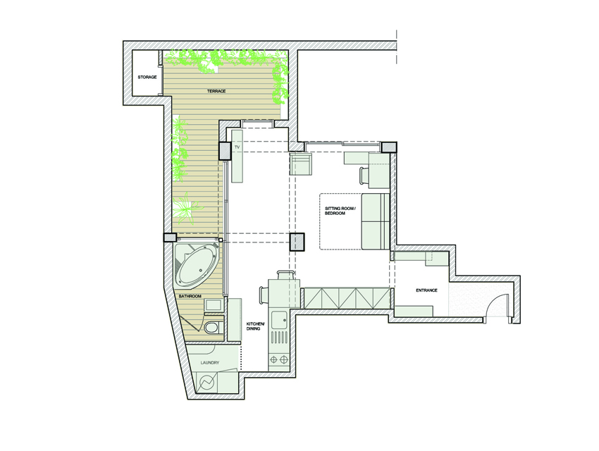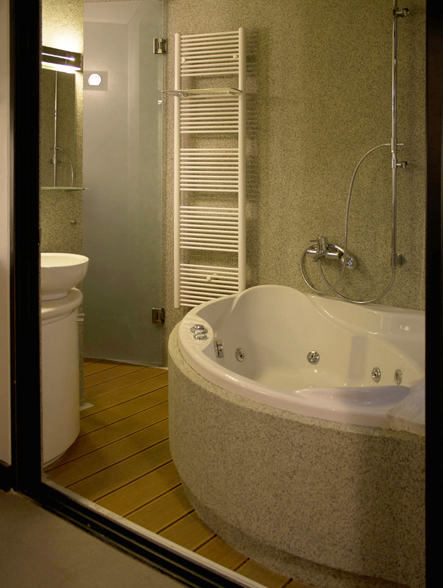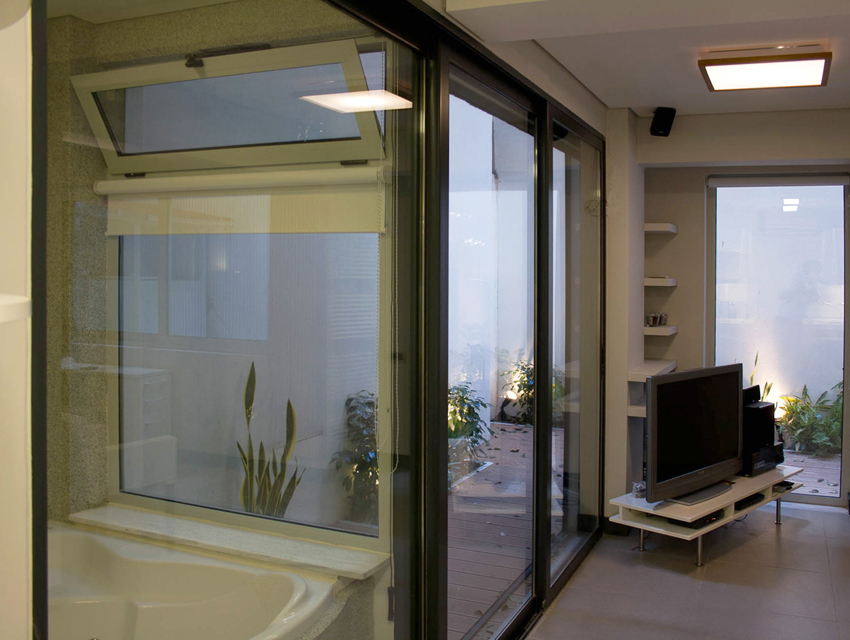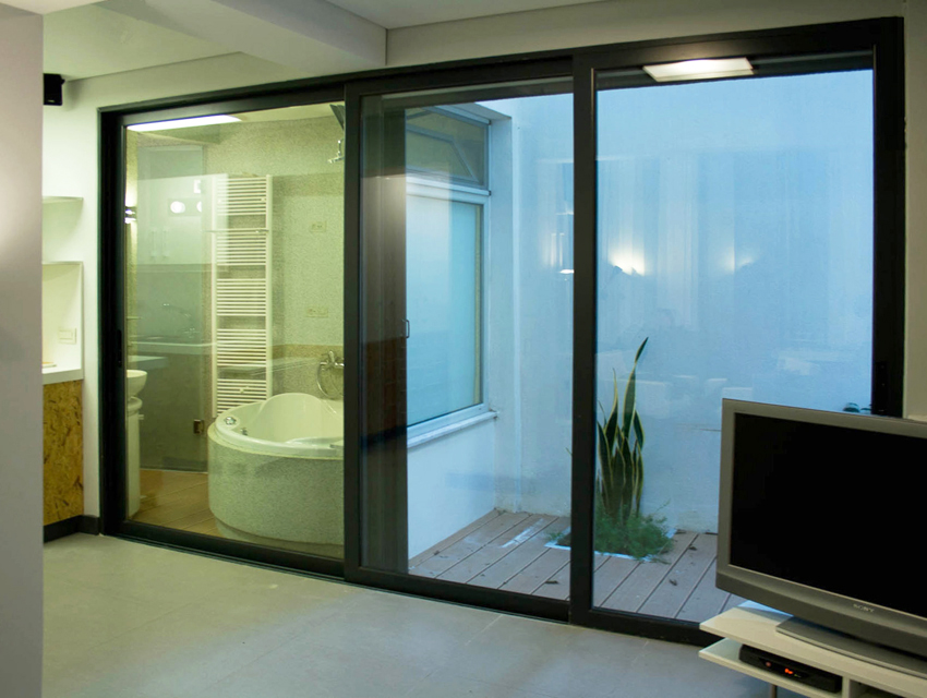 Furthermore, a 3-panel sliding glass door offers access to the terrace and, simultaneously, to the bathroom. The terrace and the bathroom floors are tiled with the same wooden deck. As a result, when one visits the bathroom, it is almost as if they are on the terrace. This impression is enhanced by the existence of a Jacuzzi, which is separated from the planted terrace by a single window. A unified result was achieved through the use of the same materials for both the storage units and the kitchen ones. And, as for the other surfaces, a variety of textures and colours were employed to enhance the ambiance of the flat, and to create the impression of a larger space via the formation of diverse focal points.