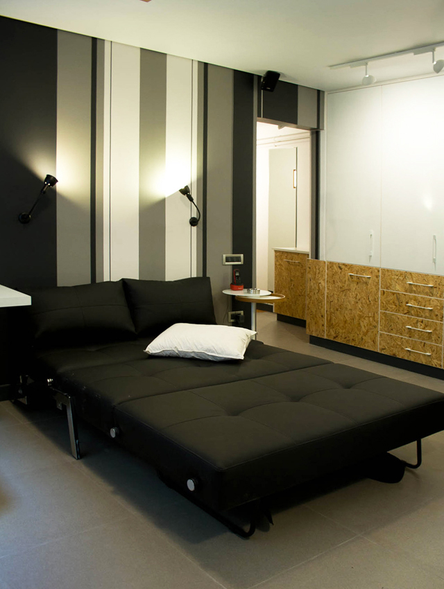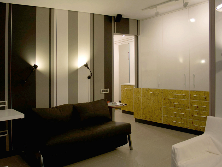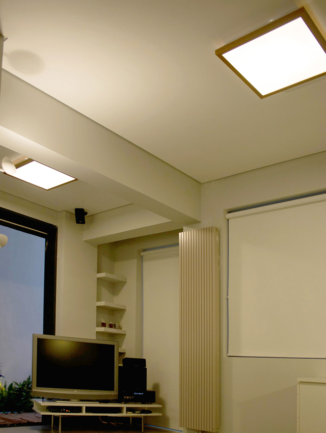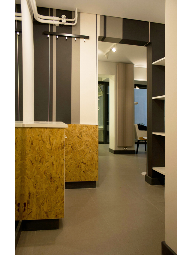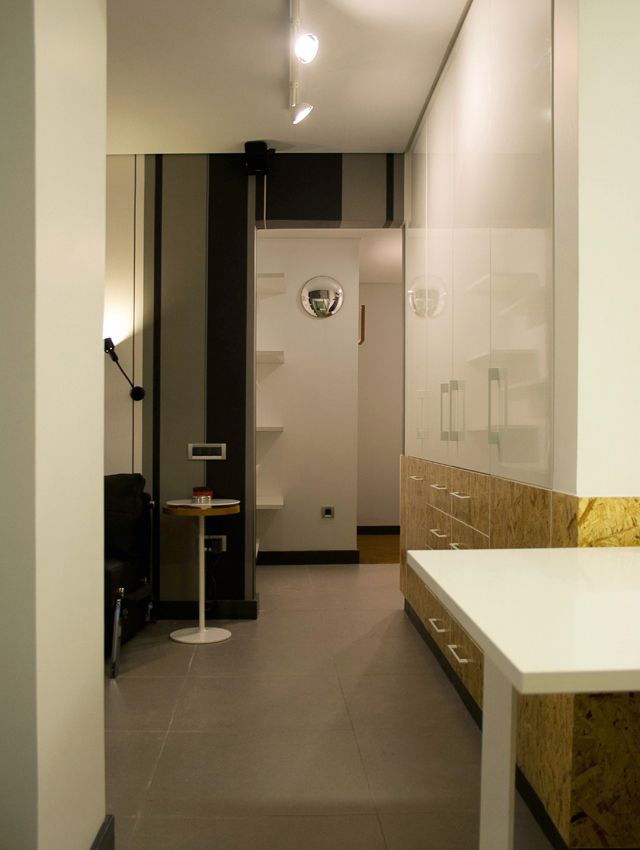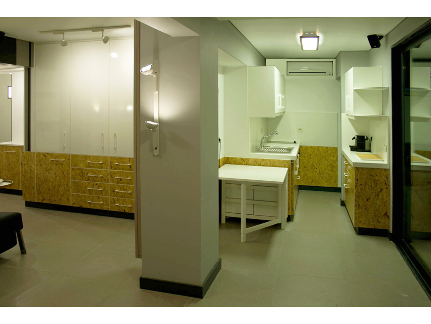 This project entailed the rennovation of an old services apartment on the lower level of a block of flats. One of the characteristics of the space was its opening onto a backyard, which was adjacent to a retaining wall. In addition, the space was originally divided into three rooms. It was rather dark, as the flat only had access to light via two small windows that faced a 5m tall wall. The ensuing aim became the limiting of the problematic aspects of the space and the utilization of its potential strengths. Thus, in order to transform that rather gloomy space into a pleasant and cosy apartment, the following design elements were applied: