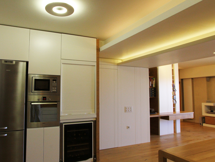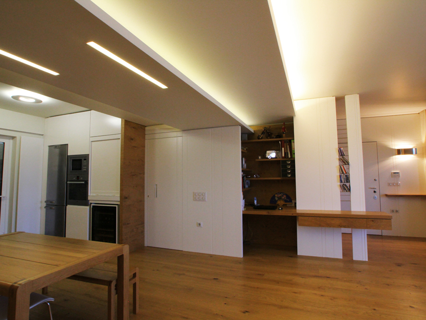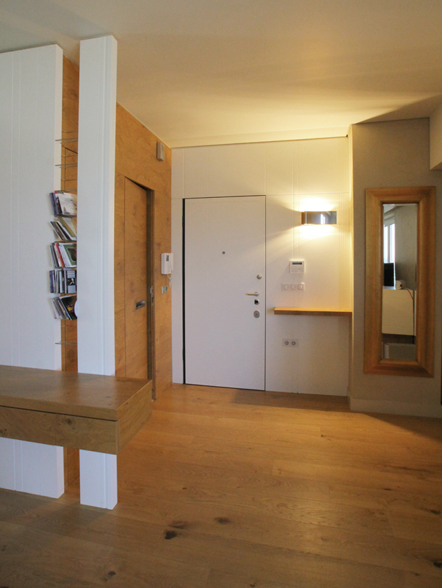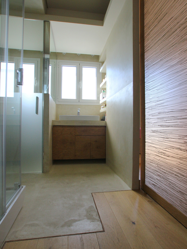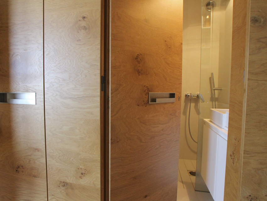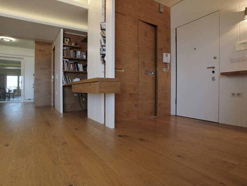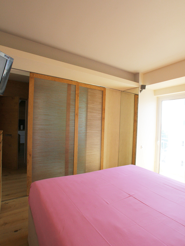 This undertaking entailed the interior design of a three bd apartment in a newly built block of flats. The client’s wish was the conversion of a three bd flat into a 2 bd one which included an en-suite master bathroom. This was based on the major concern of allocating more space to the living areas. In the context of this endeavour, journeys to Thailand became the guiding inspiration in terms of the use of materials and the general atmosphere that was to be evoked by the flat. Moving within this concept, wide rough oak planks were the primary material used for the floor and furniture fittings. The emerging need to counteract the intense effect of the wood led to the use of white semi-gloss surfaces for the rest of the fittings, positioned in vertical direction to the wooden ones. Furthermore, use was made of an ecological special cement finish for the walls and the main bathroom floor. In a bringing together of aesthetics and functionality, two sliding panels, made of bamboo sticks and resin, were used to separate the bedroom from the en-suite bathroom. Additionally, all doors were designed with hidden hinges, creating the visual effect of them being part of the wall coverings. The colour scheme of the space follows the subtle tones of linen and sand. Finally, the overall design led to the creation of an airy, bright, cosy space, which is tinted with natural colors and textures.