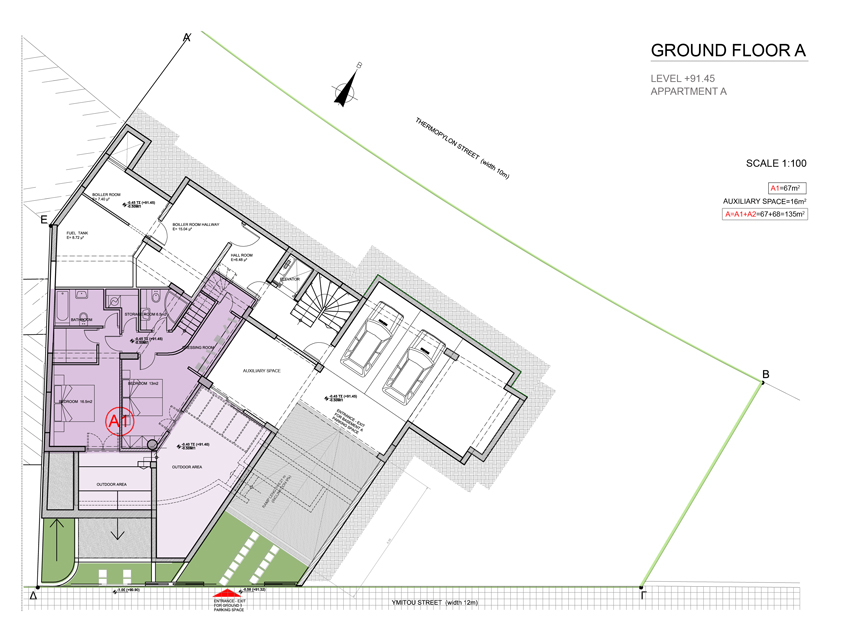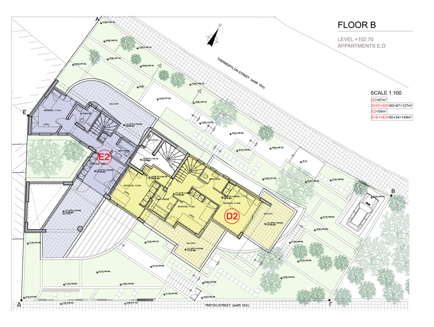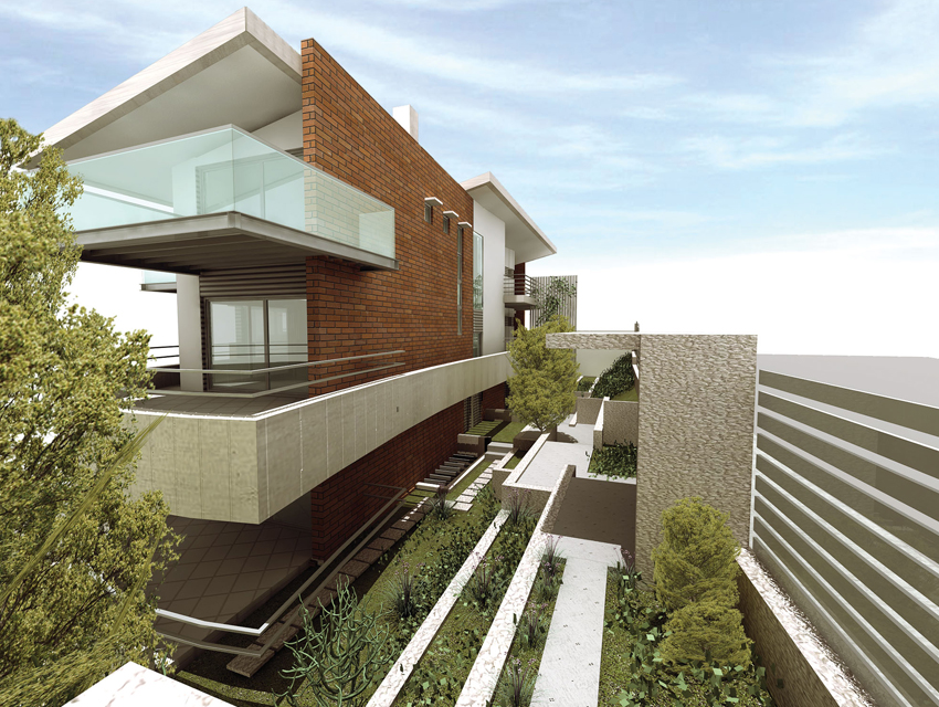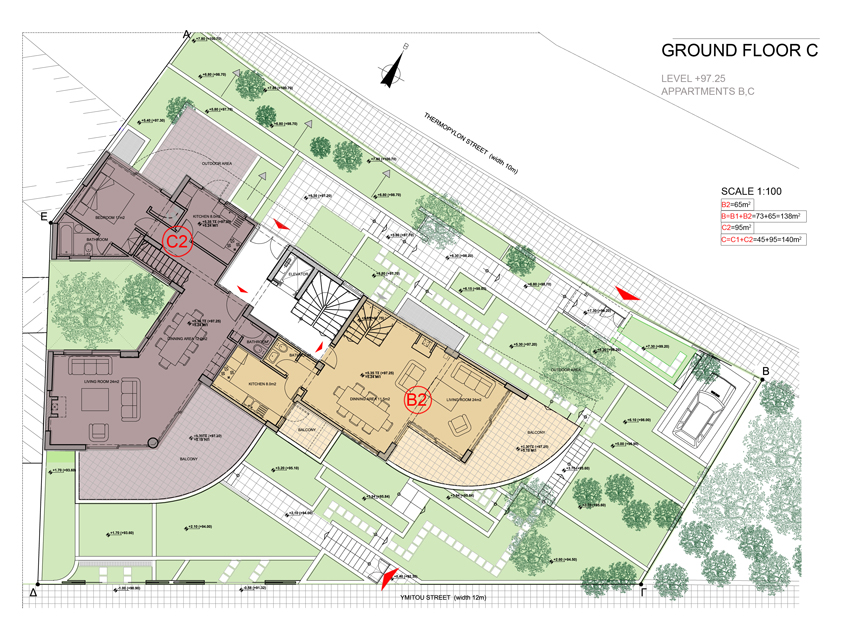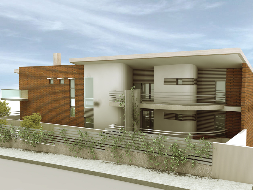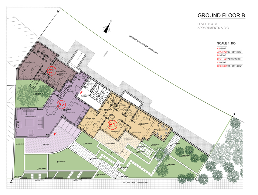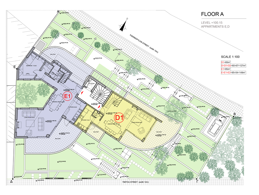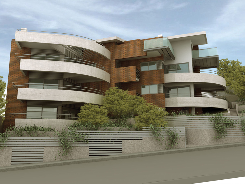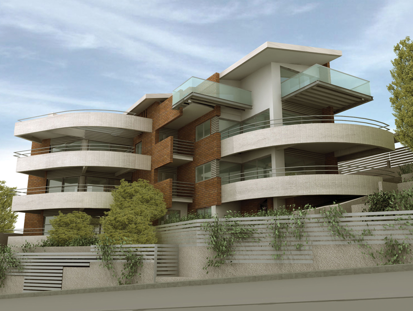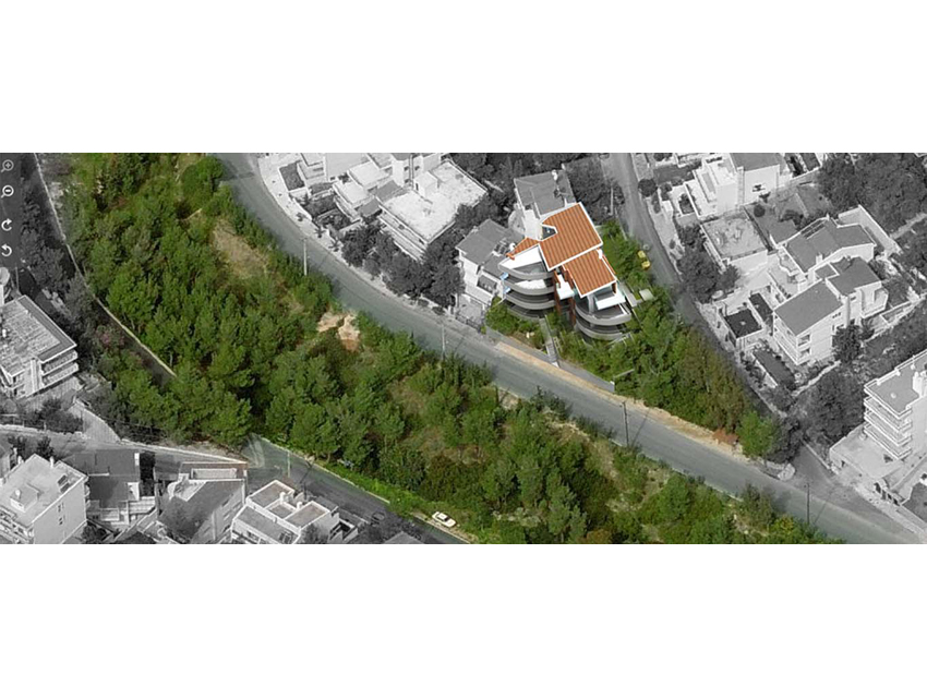 The specific apartments are located in Panorama – Voula, a suburb on the southern side of Athens. The site is on a cliff at the foot of mount Imittos. The building is of a distinctive trapezoid shape. Its north and south side open onto low traffic roads. While its west side is adjacent to a neighboring house, and its east side to a green public area. Moreover, the main façade of the building faces south and provides unobstructed views to a densely vegetated park, and partial views to the sea. Each apartment is about 150m2 and develops into two floors which are connected via an internal staircase. With windows on all sides, natural cross ventilation and lighting are achieved. Furthermore, each flat has been allotted large balconies and private green gardens to utilize the pleasing surrounding elements to the best degree possible. As a result, the relationship between indoor and outdoor space is emphasized, and outdoor activities are encouraged.