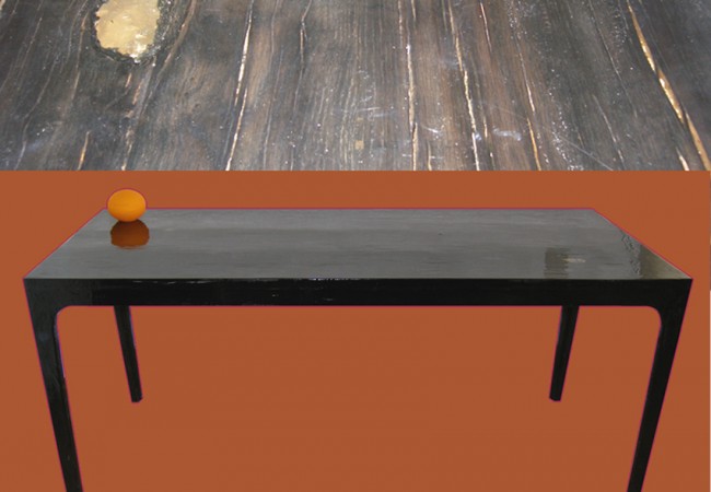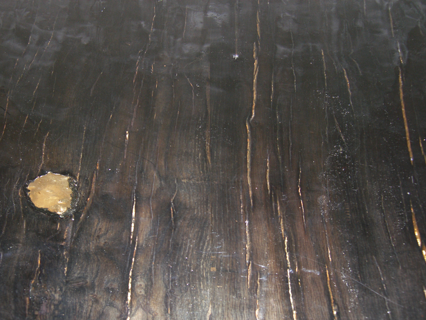 A table made of old train wooden plunks, special black paint and resin.