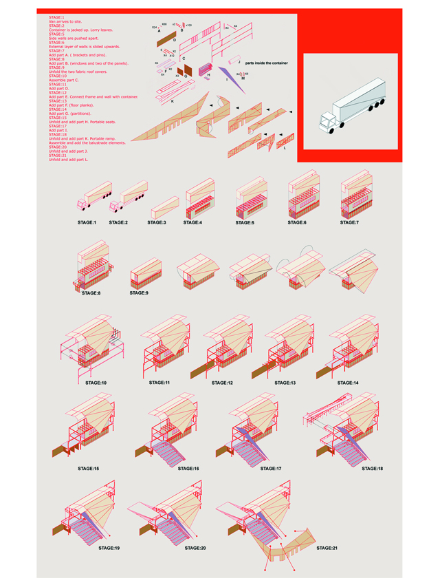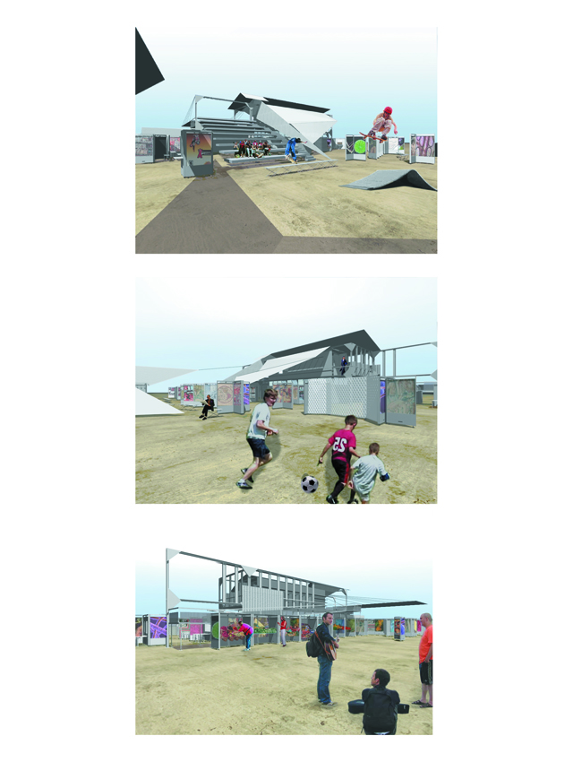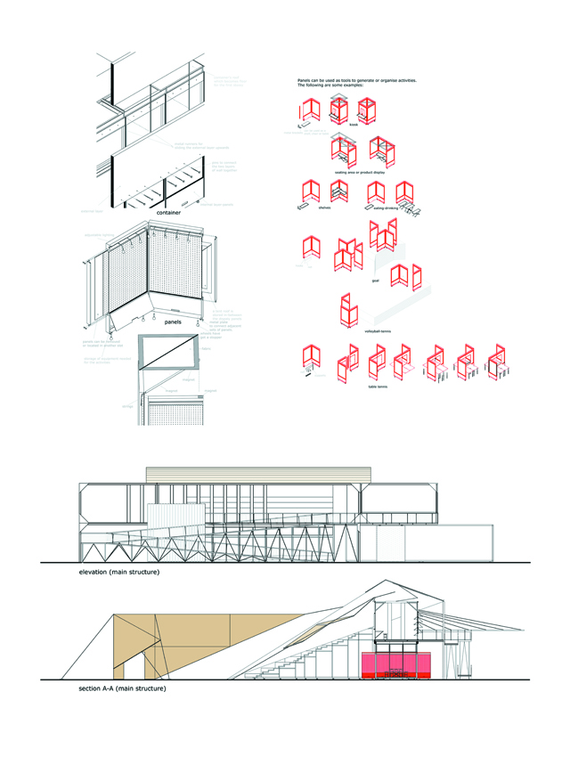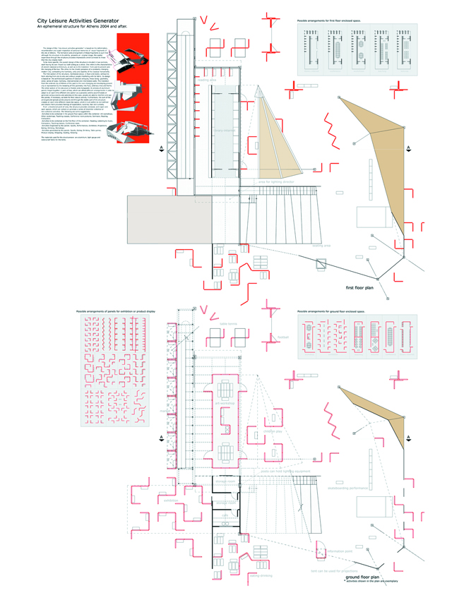 The design of this “city leisure activities generator” is based on the deformation, recombination and super-imposition of personal memories of visual fragments of the city of Athens. The formation and arrangement of this fragments is such that although the structure in its entity presents an original image, the spatial experience through the structure provokes impressions which correlate to those that the city creates itself. To be more specific, the overall design of the structure is divided in two sections, each having its own impact but both acting as a whole. One refers to the characteristics of ancient classical architecture, as well as to the transition from past to present and the merging of this two. The other, to the chaotic presence of a constantly changing modern city, contrasting the harmony, unity and stability of the classical monuments. The first section of the structure, mentioned above, is fixed and stable, without its form altering from site to site and without people interfering with its fabric. Its design is based on the architectural qualities of classical antiquity, these being: geometry, order, sense of scale, harmony, interconnected and interrelated parts. The transition from the ordered city of Athens of the past to the ever-changing and developing present city is represented by the breaking of this geometry into fluid, arbitrary lines and forms. The other section of the structure is flexible and changeable. It consists of aluminum panels hinged together is pairs of two, which can afford different arrangements in order to adapt to an each time different site (action as a parasite) and to accommodate or generate various events and activities. In this case, people are able to interfere and use these panels, if necessary, as tools for their leisure activity. Furthermore, the sum of the arranged and spread panels around and through the stable part of the structure, creates an each time different maze-like space, which in turn, within its non-defined and chaotic form provokes feelings of expectation, surprise, fear and curiosity. From a functional point of view the, the structure provides enclosed, semi-open and open spaces, which can contain or generate a series of dissimilar collective or non-collective activities.