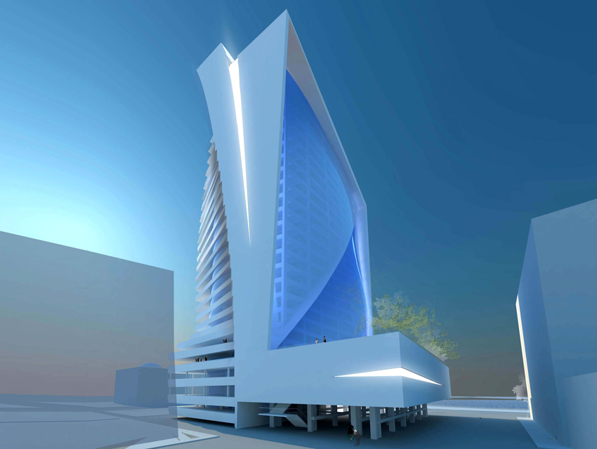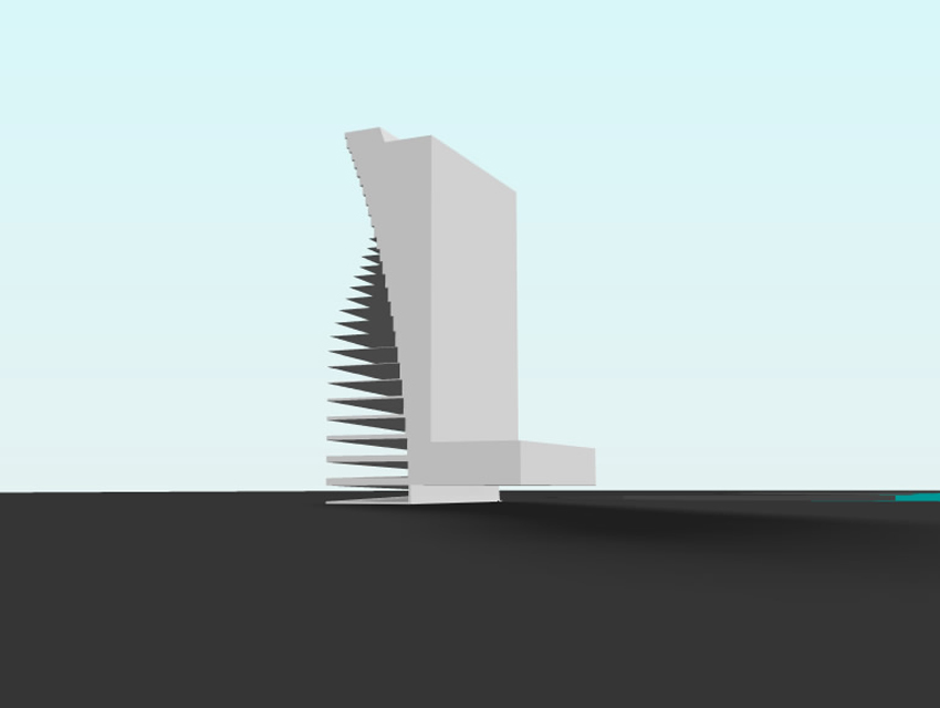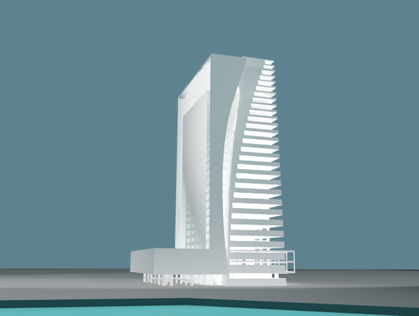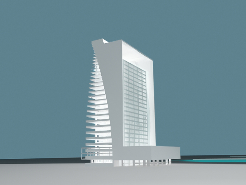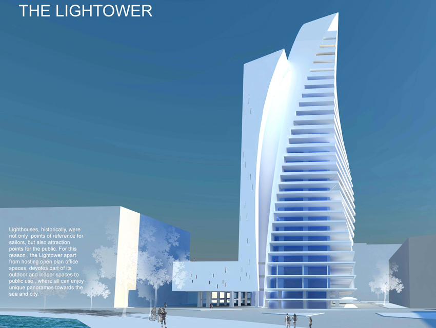 The tower of Piraeus changed the beloved image of the “clock” and is now called upon to alter its own, previously negative, image. The lightower dominates the vital junction point it stands in: a junction of vital meeting points, sea and land, port and town, Piraeus and its surrounding urban and global areas. The need for a transformation of the lightower into a new landmark—with positive, rather than negative connotations— is connected to the concept of a wider reaching rebirth: the rebirth of an urban infrastructure. In the context of this endeavour, the existing tower structure is to be incorporated into a new form, through cooperative interaction with the new creation. In this project, a reverse design process is set into motion. Subtraction, rather than addition, is the method opted for. Morphological elements inspired by the sea and the Greek urban typology, are projected via subtraction on the imagined volume of the space. The long, wave-like, vertical side of the building evokes images of the sea, the linear shaping of levels on the other side mirrors the characteristic ‘apartment block’ with protruding balconies, while the top end of the building and the curved horizontal sections bring forth images of boats—a familiar element of Piraeus harbour. The envisioned result of the procedure is a new tower which enters into a ceaseless interaction with its environment. Furthermore, the design draws on the visibility of the lightower –since it is, after all, the tallest building in Piraeus—, and envisions a powerful play of reflection and projection of light via the new building structure. The aim is for the lightower to take on its new role, to become generator and participator in a new relationship between the Piraeus port and the Athenian urban landscape. The new lightower embodies characteristics of the traditional lighthouse. Specifically, it functions as a point of reference, in the sense that its height and location offer unique sea and city views, and it also offers a form of open access, by dedicating parts of the office building to public use.