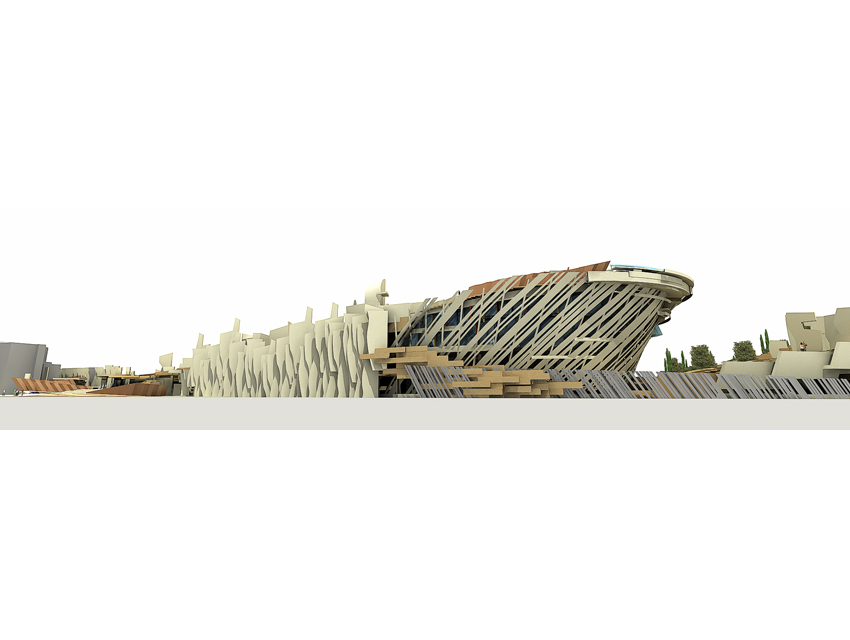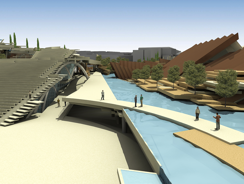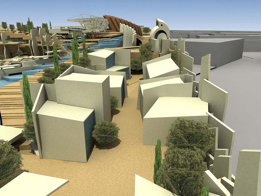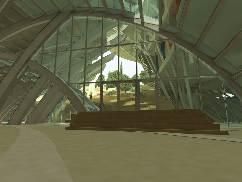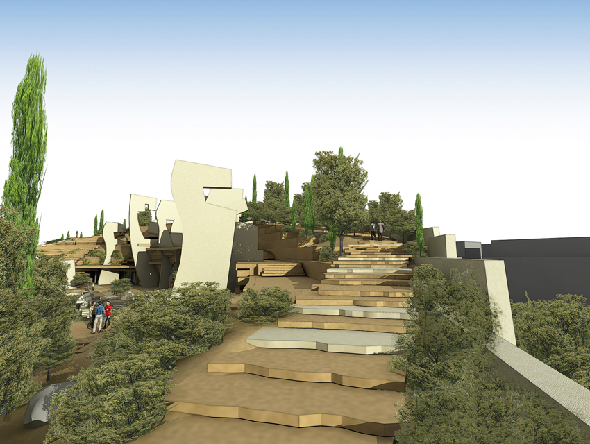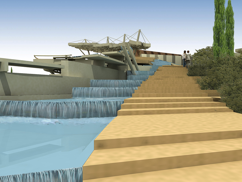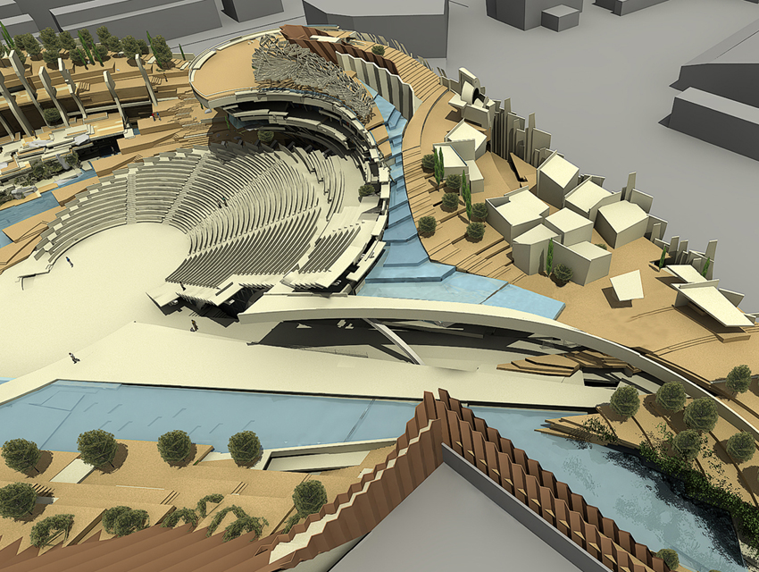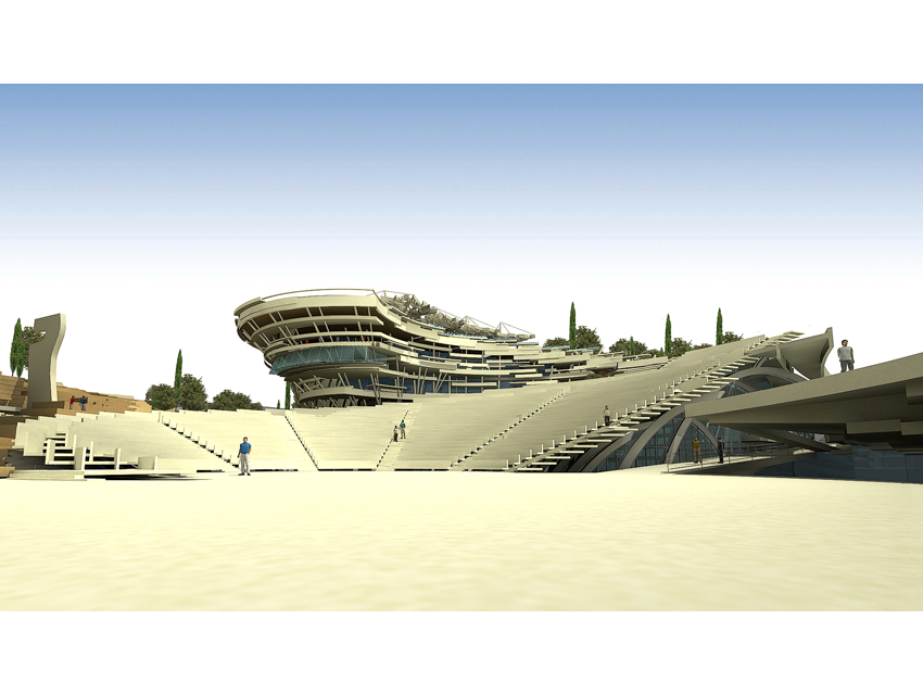The Research centre (complex A)The general form of the space is generated by a singular merging: a merging of a hybrid spatial structure—inspired by the natural development of the ancient Greek theatre in its topographical context— and of a freestanding structure resulting from the steep, gradual elevation of a planar, horizontal surface. The research centre, which consists of offices, virtual reality laboratories, a library, shops, a restaurant and a café, is located under the inclined stepped landscape. On the roof, a cluster of small white structures –housing shops and exhibitions—, forms a small village, based on the prototype of proto-urban Greek settlements. Particular attention has also been given to the landscape design of the roof, which includes extensive planted areas of Greek flora, as well as water installations. At the foot of the hill we find the park entrance: the start and finish of the mythology route, the start and finish of a journey via land or water. Finally, another two characteristics of the whole building are the extensive use of cladding elements, as well as its impressive support structure that resembles a ship’s prow.