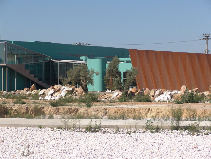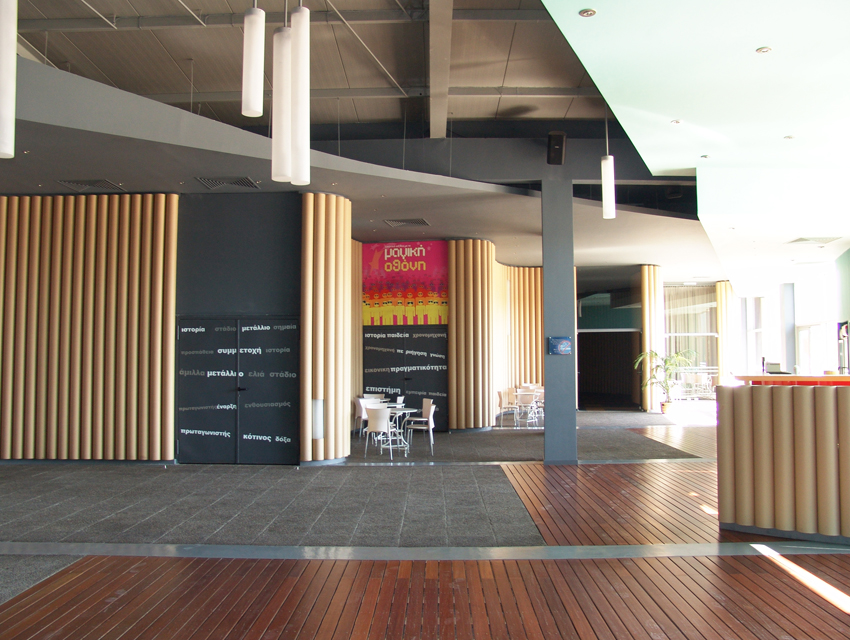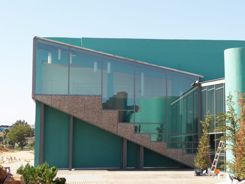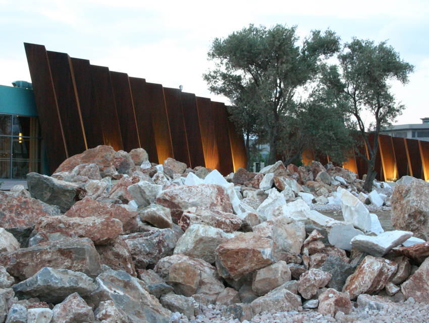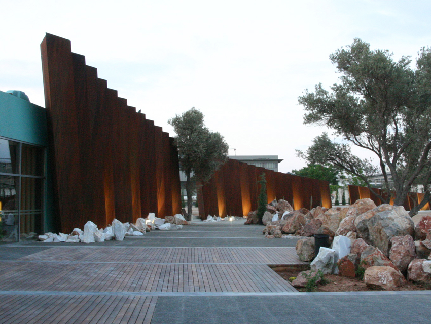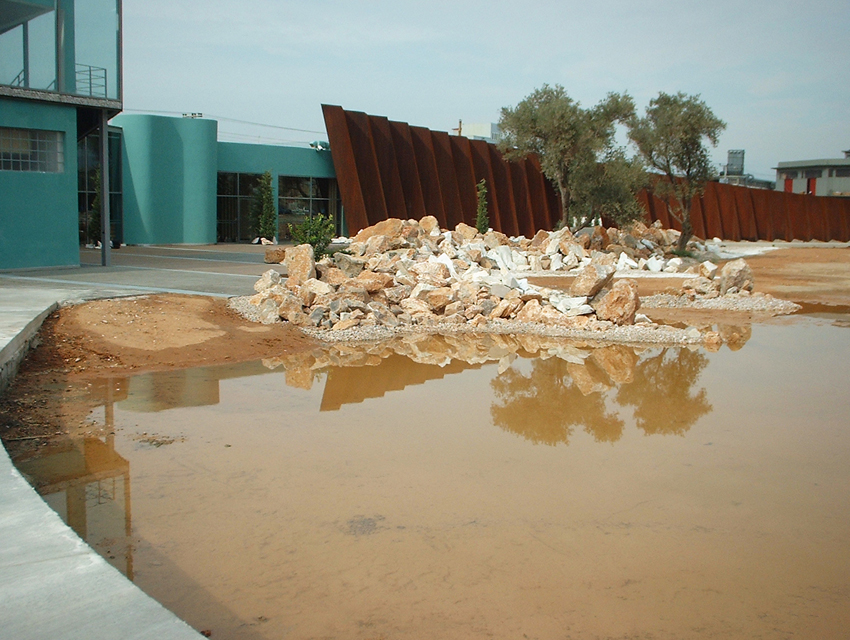 his project involved a requirement, by the Hellenic Cosmos Institution, to transform an old, deteriorated industrial building, located on an extensive industrial site, into an exhibition centre. The latter was to take on the role of a cultural centre that would consist of a variety of indoor and outdoor spaces. “Building 7” was the first trial step towards this realization: a realization that embodied the possibility of the building’s complete or partial future integration with the wider, land re-development program. The new architectural intervention is not aimed at the revelation of any architectural industrial character. Therefore, the building was approached as a coalition of structures which would engage new materials and forms, in an attempt towards a complete reformation. At the same time, the selected forms and materials would operate simultaneously on micro and macro-scale levels, as they were required to both withstand the passage of time and inspire future functions and new structures. Through the special use of raw, recycled materials, the building acquires a character which is both “ephemeral” and ”permanent”, and, simultaneously, becomes itself, an art object. Materials were chosen based on their inherent properties. Specifically, massive rocks, rusty iron sheets, blocks of stone enclosed in pre-cast wire, paper tubes, paving slabs, wood, and so forth, are manipulated into sculptural objects. These sculptural objects are in some parts juxtaposed with the existing shell, and, in others, form a formal continuity with it. In yet another architectural erosion of boundaries, special emphasis has been given to the relationship between interior and exterior space, through the insertion of external forms and materials into the internal space. Finally, the design axis, the curves and the visual relationships of the building are derived from a wider masterplan design, which has been applied to the whole site.