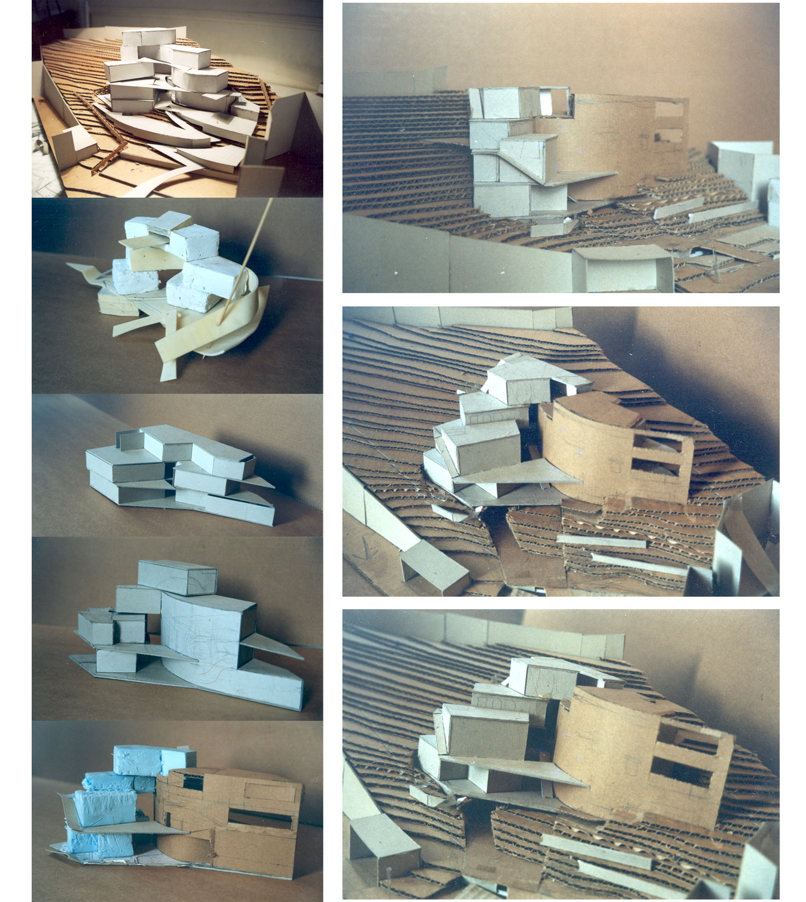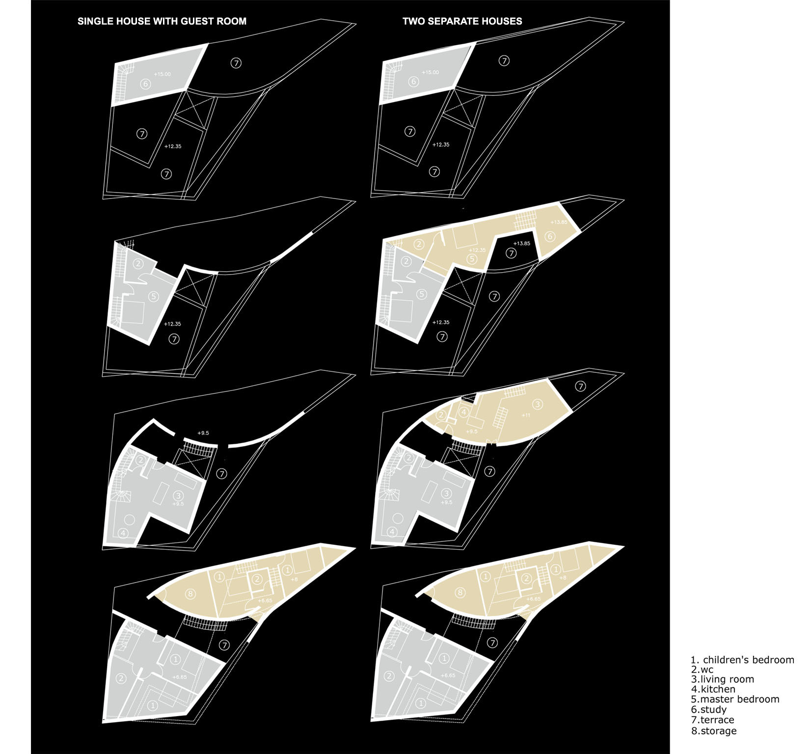 This project concerns preliminary ideas and an overall design concept for a house on the island of Chios. The client’s request was to design a family house with a private quest room. This request contained a basic prerequisite: that the newly designed house would be able to be divided into two separate, fully functioning houses, in the future. The way the arrangement of different structures serves this requirement is made evident in the plans. The overall morphological shape of the building draws inspiration from this island’s impressive elements and subtle contrasts. Specifically, the morphology of the building is achieved by means of a dynamic combination of a curved, stone-cladded, geometrical surface with a vertical arrangement of white-washed cubical volumes. A significant aspect of the curved surface is its changing role from the first building phase to the second one. Specifically, in the first building phase the curved surface serves as a stone curtain on the landscape, while in the second phase it takes on a more functional role by being expanded at its rear sector to accommodate extra rooms.