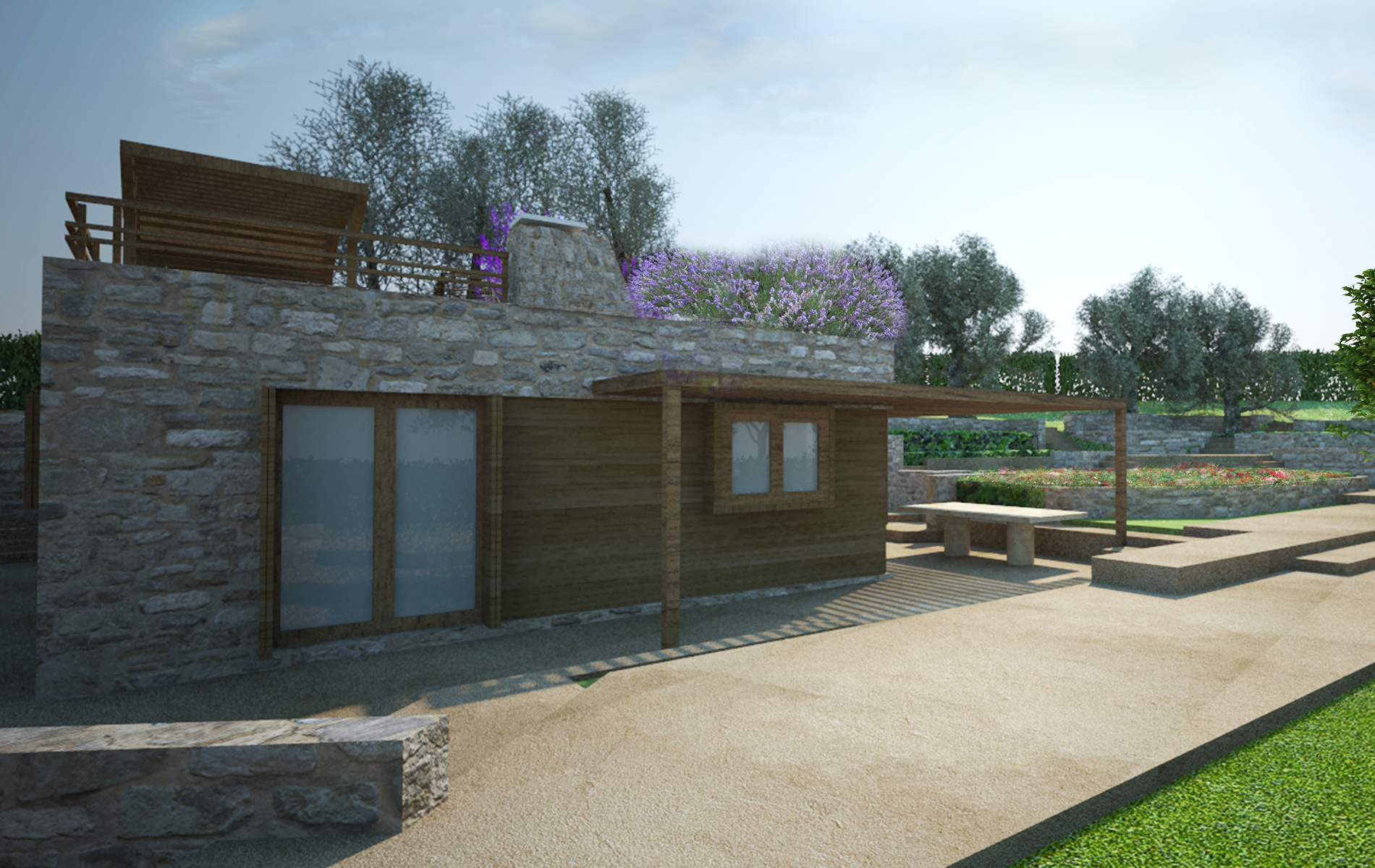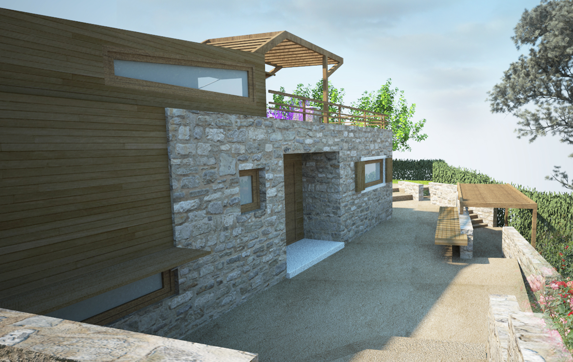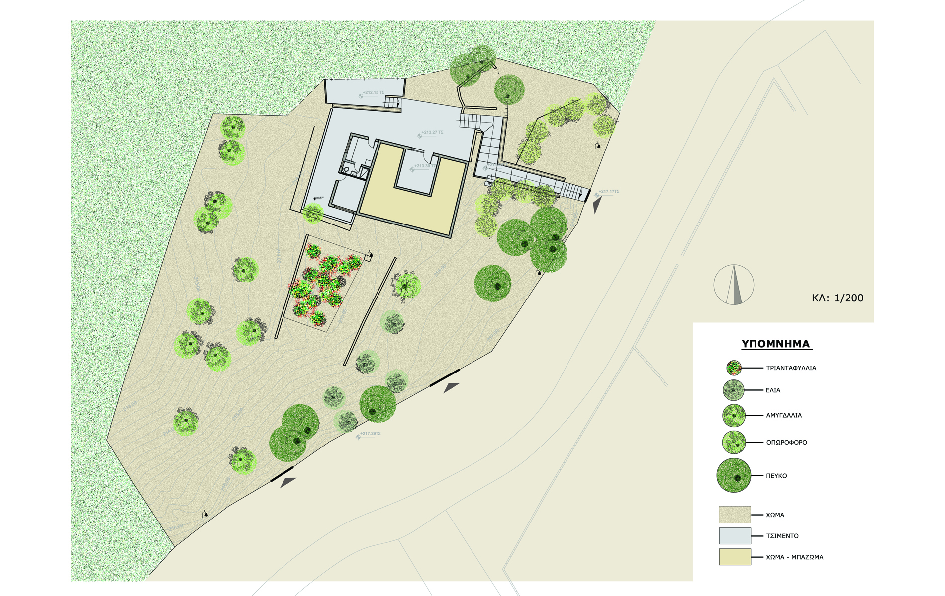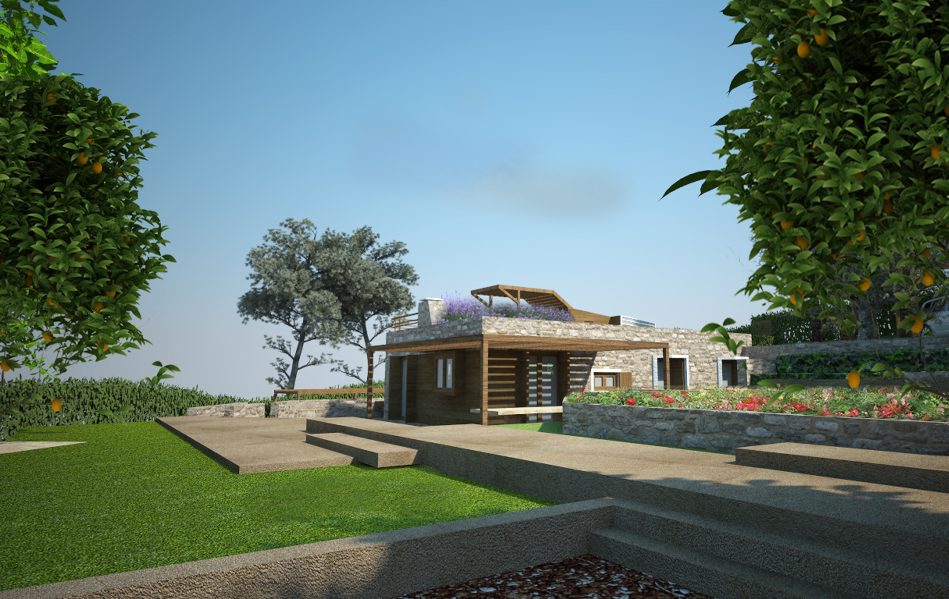 The first stage in the development of this project was the presentation of a design proposal for the reconstruction and renovation of a 100m2 residence, which would include the addition of an attic, and of its 1400m2 surrounding land, which in its turn, was to incorporate outdoor sitting areas, an orchard, a parking area and a tree-house.