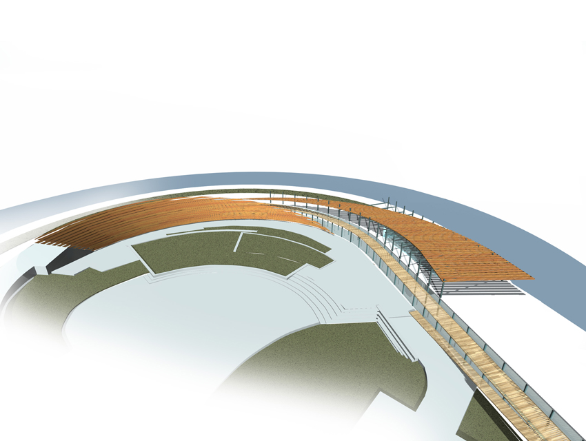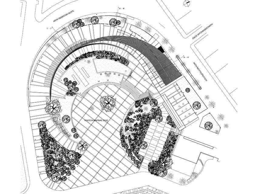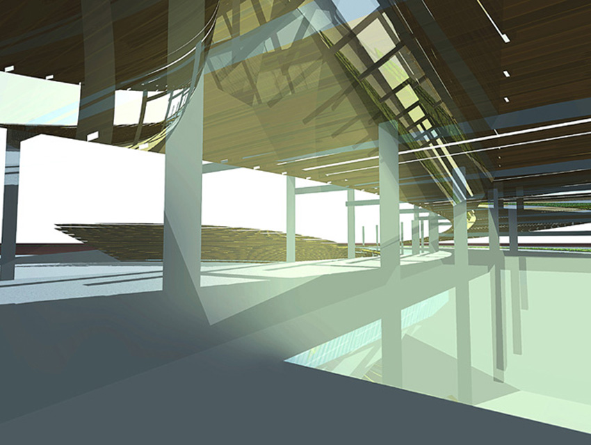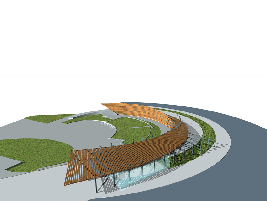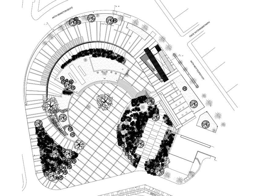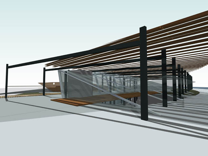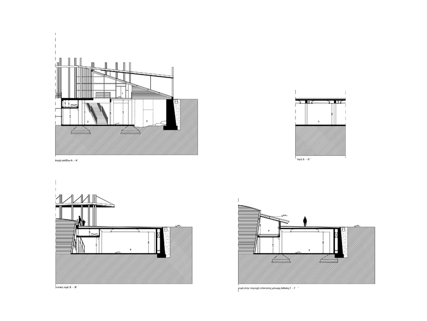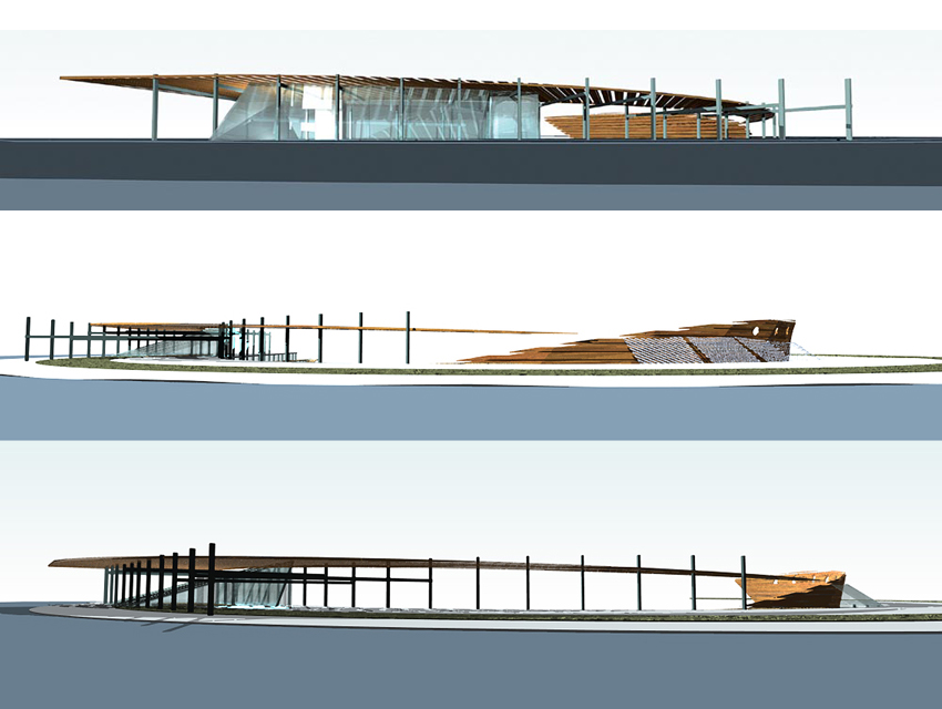 The Hellenic Maritime Museum was founded in 1949 and is the oldest and largest Maritime museum in Greece. It houses a collection that consists of 2,500 exhibits, which includes paintings, scale models of ships, documents, rare maps and objects. At the museum’s entrance lobby, one finds the impressive ancient fortification walls of Koron—walls that once protected the city from rough seas and military intrusions. The request was to propose a new design for the museum. This design would include the rearrangement of the museum’s exhibits and storage spaces, the redesigning of the display units, as well as, the renovation of its façades and outdoor space which have the objective of creating a visual connection with the adjacent urban fabric. Old wooden ships –in terms of their shape and materials— have been the inspiration for the overall design proposal. Based on this concept, a horizontal and a vertical surface are employed to formulate and reorganize the museum’s interior and exterior space. Additionally, they serve the parallel aim of lending the museum a new personality. The vertical surface, which plays the part of a ship’s hull, is constructed out of horizontal timber planks. This surface works as the museum’s main façade and, additionally, redefines the lower level of the front of the building facing the sea. The back of this surface evokes a ship’s hold, storing the exhibits as valuable treasures, and, simultaneously, forms an impressive background. The vertical wooden wall exceeds the upper outdoor level in height and is, thus, rendered visible from afar. Furthermore, the use of skylights on its rear section allows for a sense of visual continuity between the pedestrians and the museum’s inner space. As regards the horizontal surface, this possesses a dual role. It provides a cover for the glazed atrium of the upper outdoor pedestrian route—which also hosts the new entrance of the museum, and also provides the space with shaded areas for the hosting of outdoor exhibition events. As a final design gesture, a smooth outdoor ramp, attached to the building’s façade, re-connects the upper entrance level to the lower piazza which opens towards the sea front.