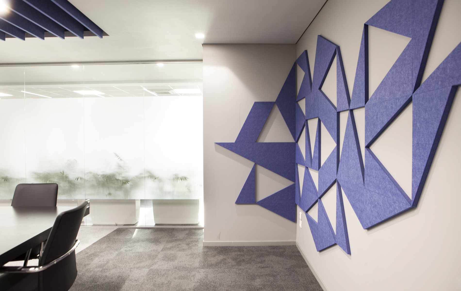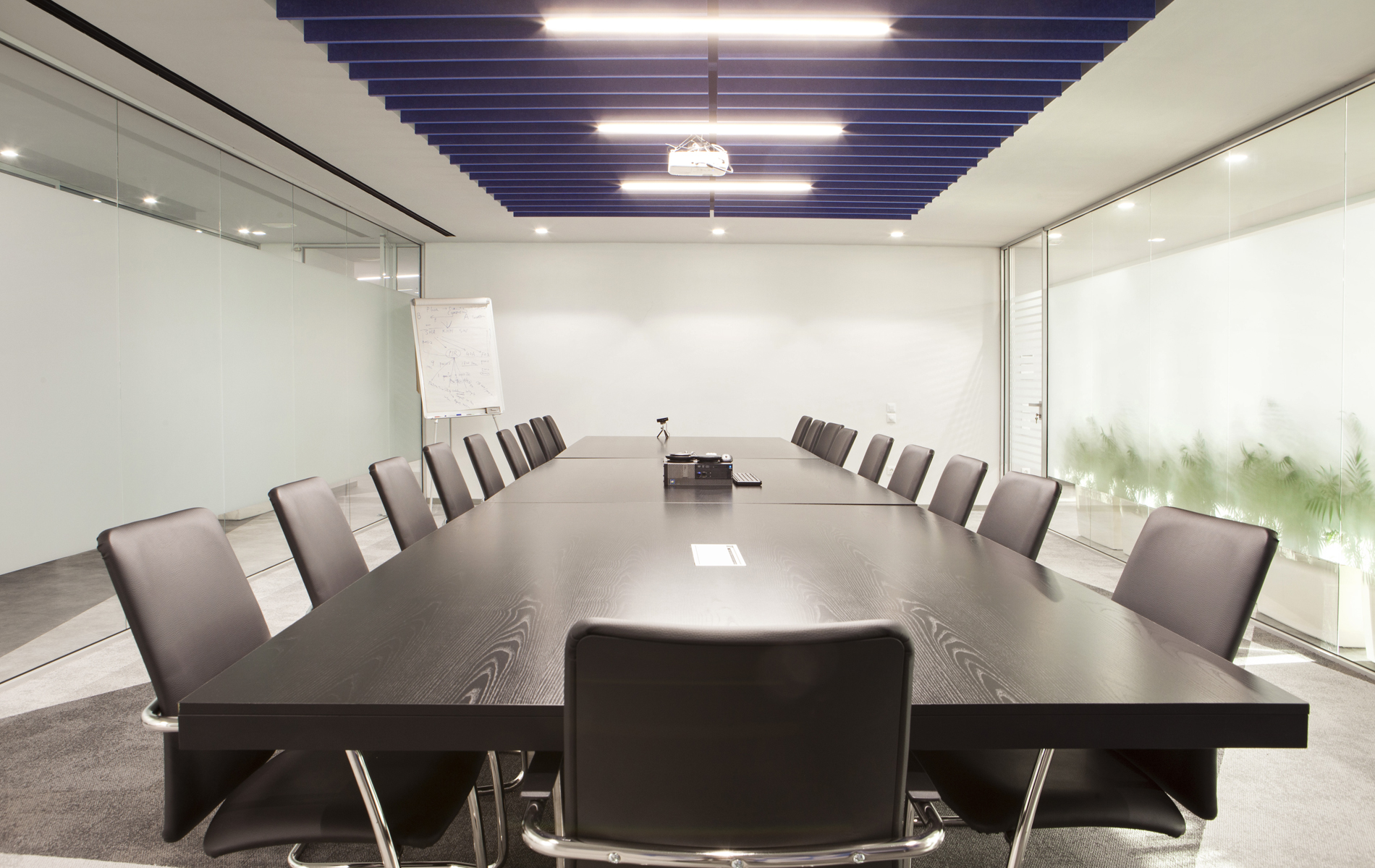 To decrease sound reflection and echoing in the conference rooms, soundproof materials and elements have been applied.