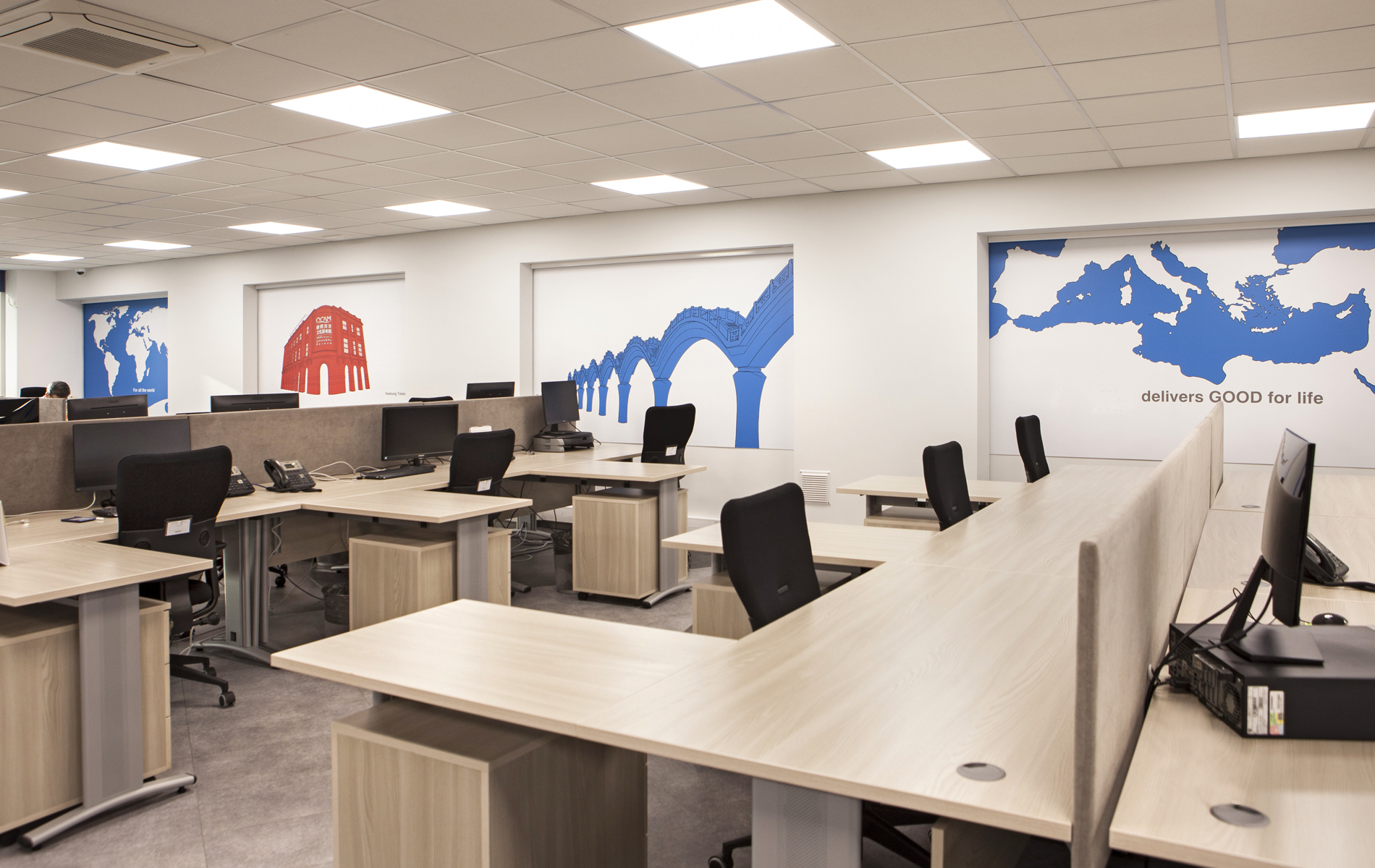 The latter’s wide rectangular space had to be divided into two conference areas, an open plan working space, offices for the directors and service rooms.