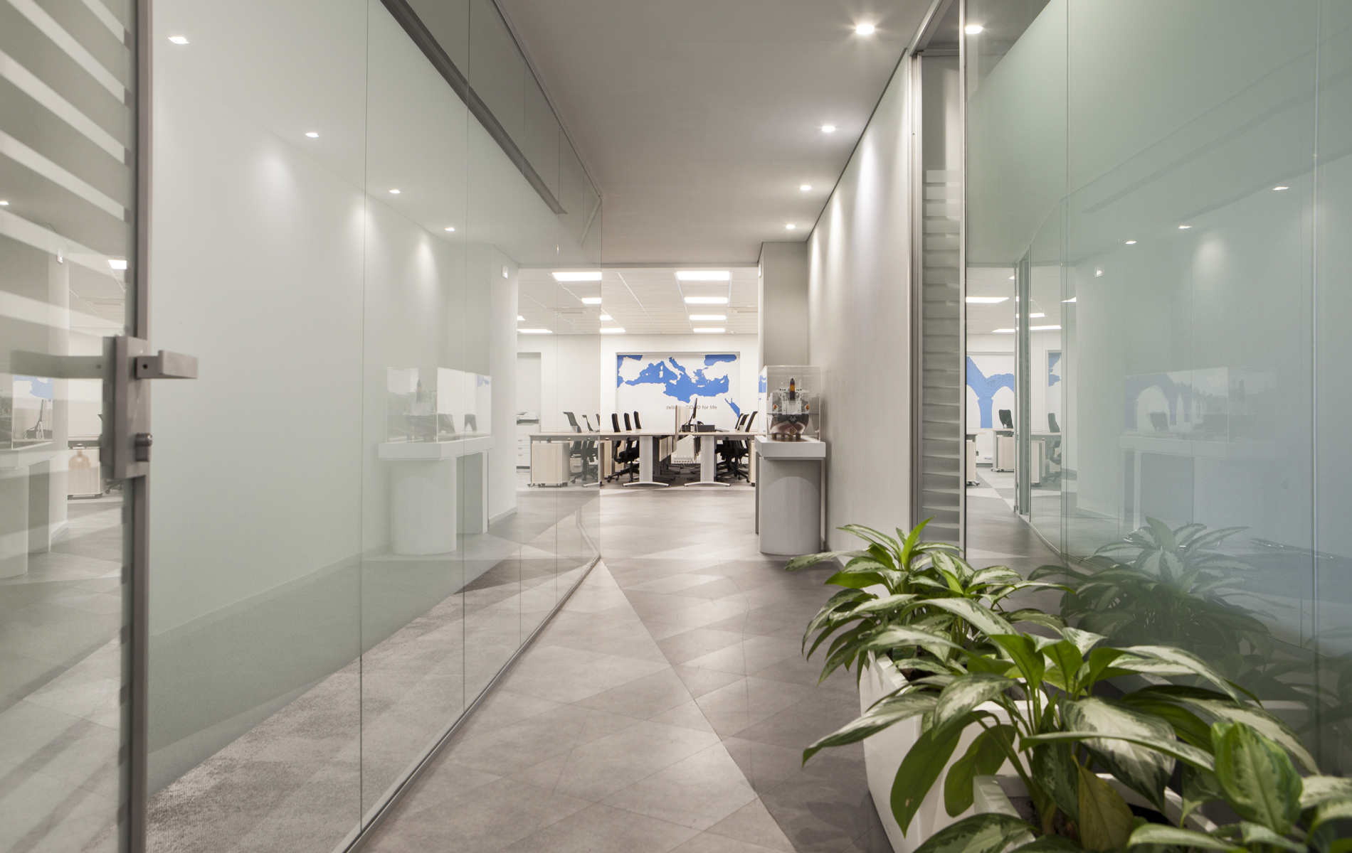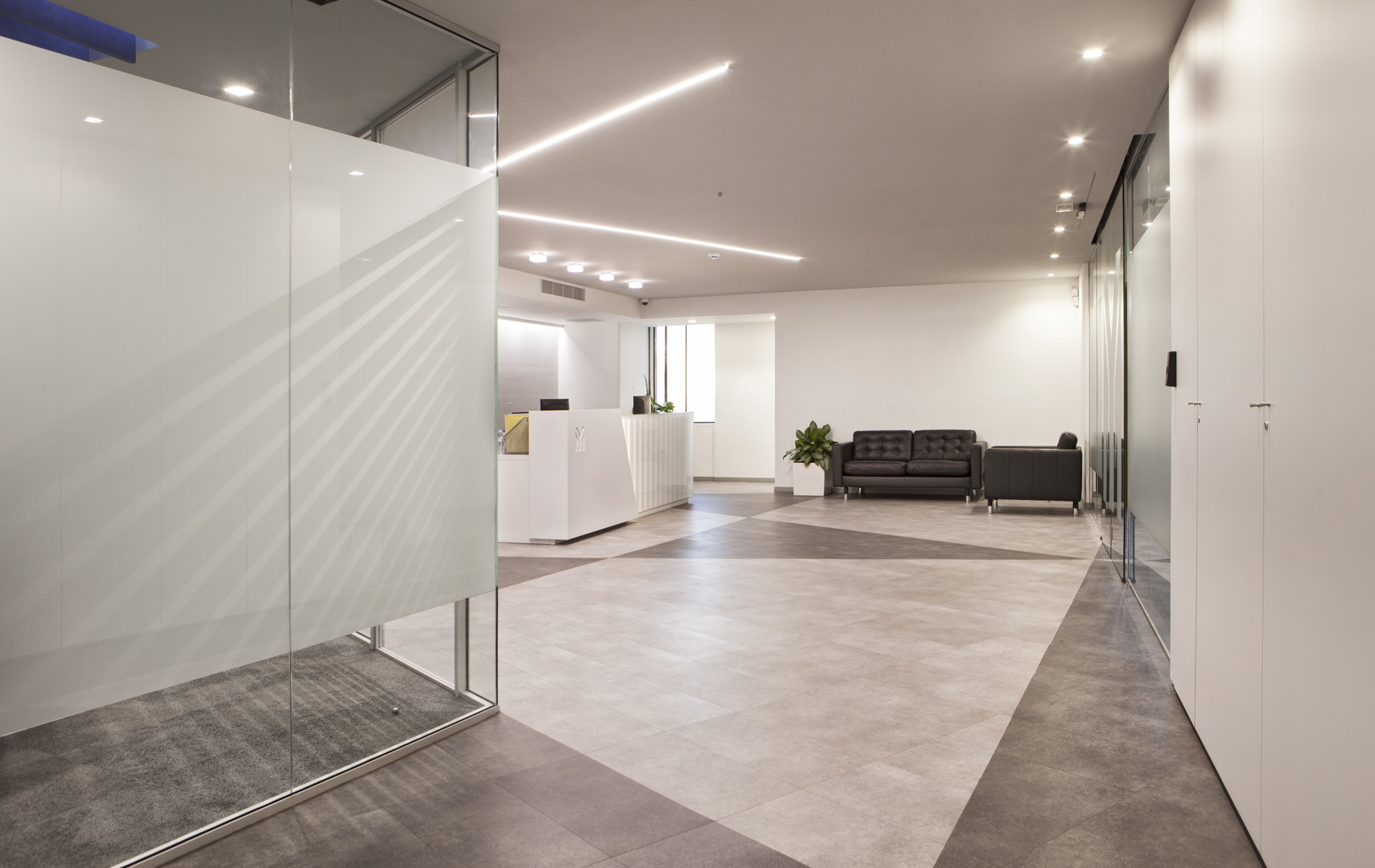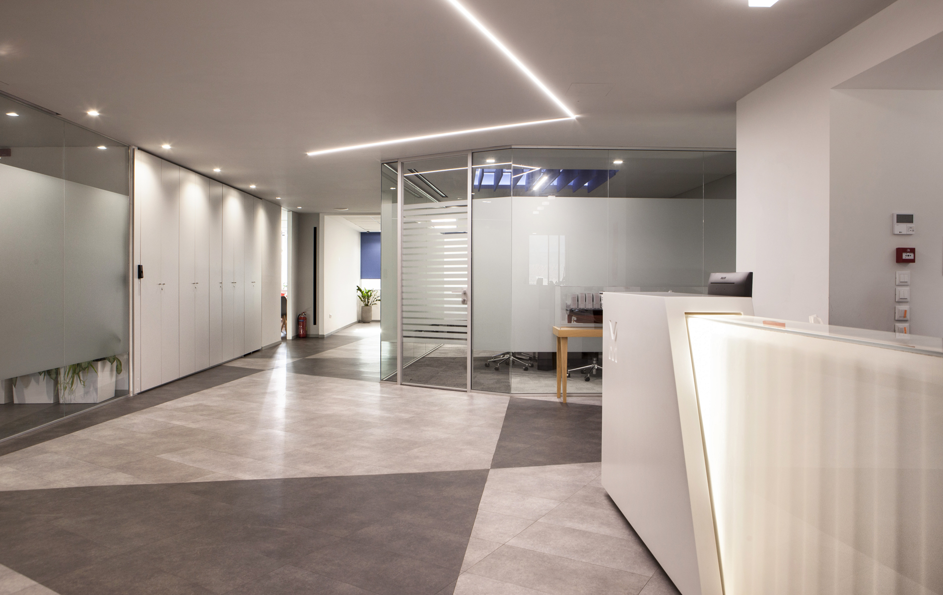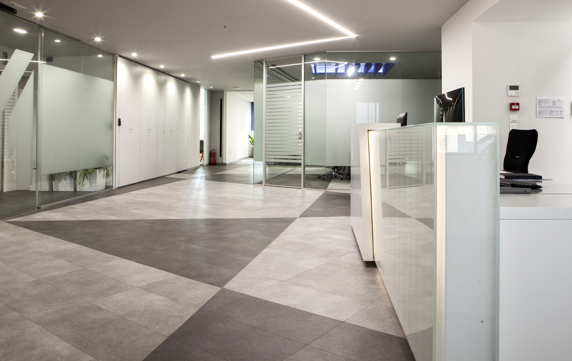 During design phase, an overlaying of diagonal and orthogonal grids was used to achieve a more functional and continuous movement flow together with interesting visual perspectives. This also led to the design of the vinyl floor pattern as well as the space shaping of the two meeting rooms.