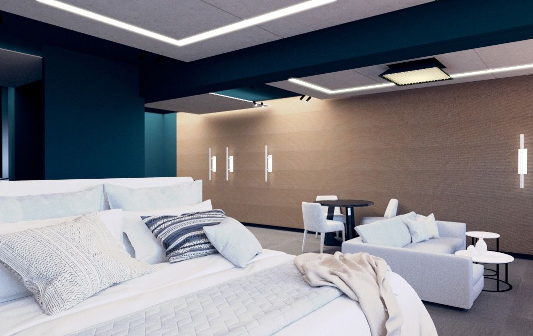 For this reason, the general arrangement of the space as well as the choice of all the interior wall and floor surfaces, lighting, general color and texture scheme are such that suite both cases.