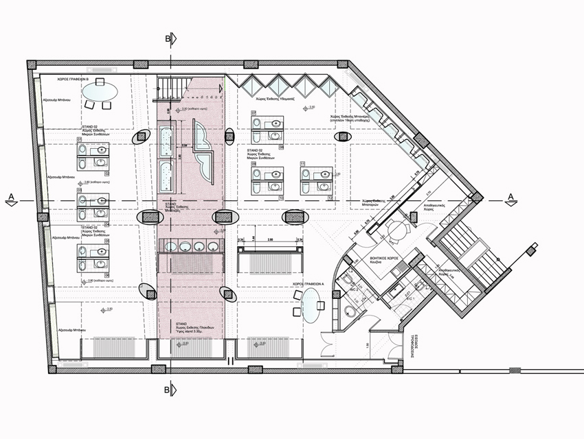 This project involved a major exhibition showroom of SEYDAP (Association of Mechanics and Plumbers), an up-and-coming company, active both in the retail and the wholesale trade of B&K utilities, sets, accessories, wall & floor materials and tiles. The overall design of the interior space is based on two major creative themes that create a pleasing juxtaposition of solidity and fluidity: