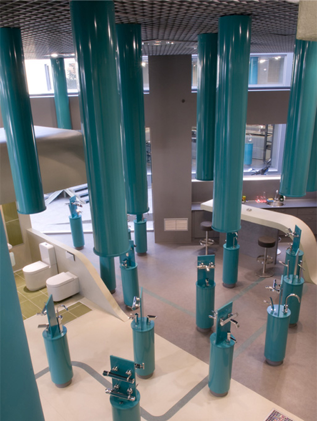 - Vertical tubes, in the form of split blue columns, become display units for chrome bathroom and kitchen taps. More specifically, taps were fitted onto the lower section of the column, while a lighting fixture on the top section of it illuminates the exhibited products.