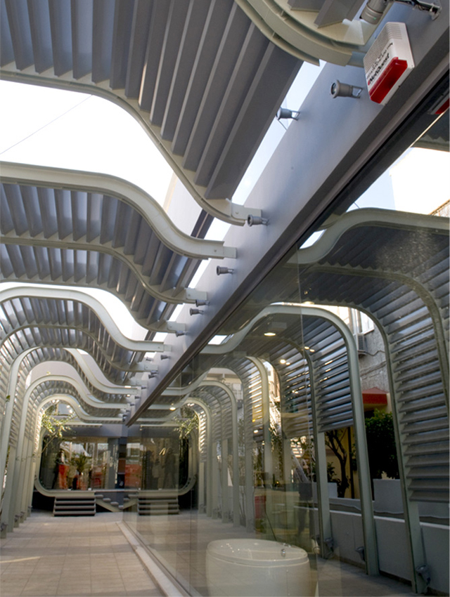 - Display units as waves: Structures rise in flowing curves from floor to ceiling. This effect is mirrored in the exterior space, where similar wavy lines are used to create arcades and sheds.